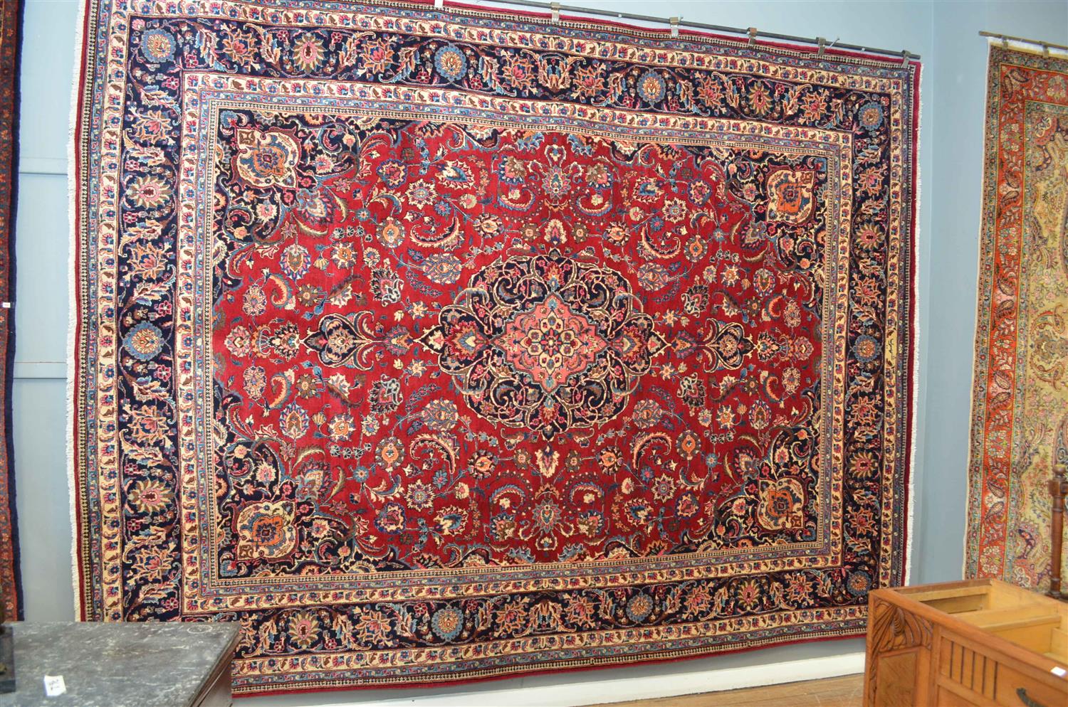 SUPER FINE SIGNED MASTER WEAVE STUDIO MASHAD PRISTINE CARPET, ORIGIN NORTH EAST IRAN, HAND KNOTTED IN ALELIER (SHAHIDI) WITH THE FINEST KORK WOOL IN RICH CRIMSON & DOUBLE ANCHOR MEDALLION AND SIGNED PIECE, COMPRISING OF PERSIAN INDIGO BLUE BORDER. SIZE 386 X 295cm RRP $12500, GALLERY CARPET