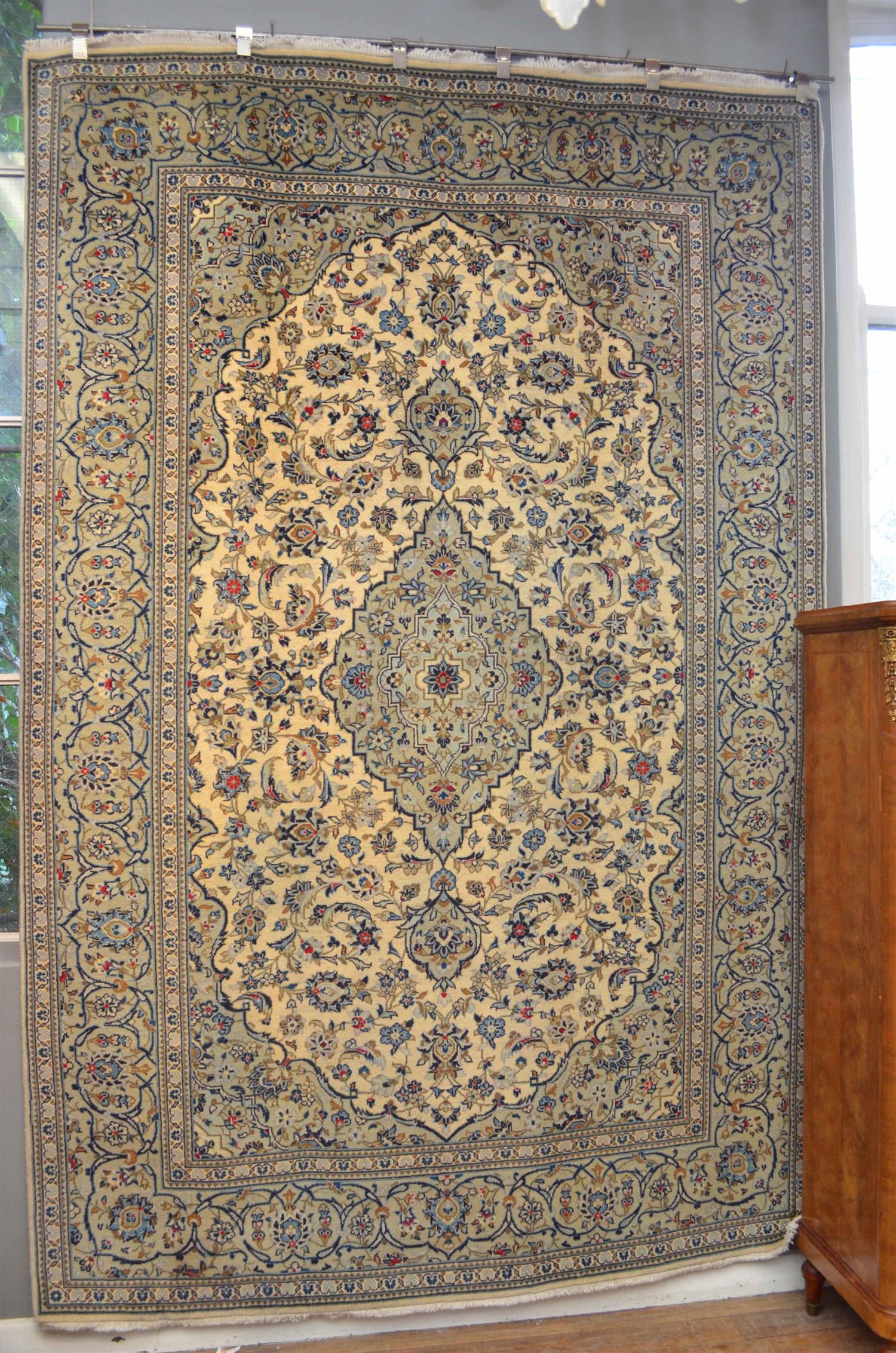 PERSIAN ORIGINAL KASHAN CARPET, HAND KNOTTED CENTRAL IRAN WITH DENSE WOOLEN PILE IN IVORY GROUND COLOUR AND PISTACHIO GREEN MEDALLION AND BORDER SURROUNDED WITH FLORAL ROSSETS. IN PRISTINE AS NEW CONDITION EX GALLERY RUG, FIRST TIME OFFERED, (302 X 204cm) RRP $7900