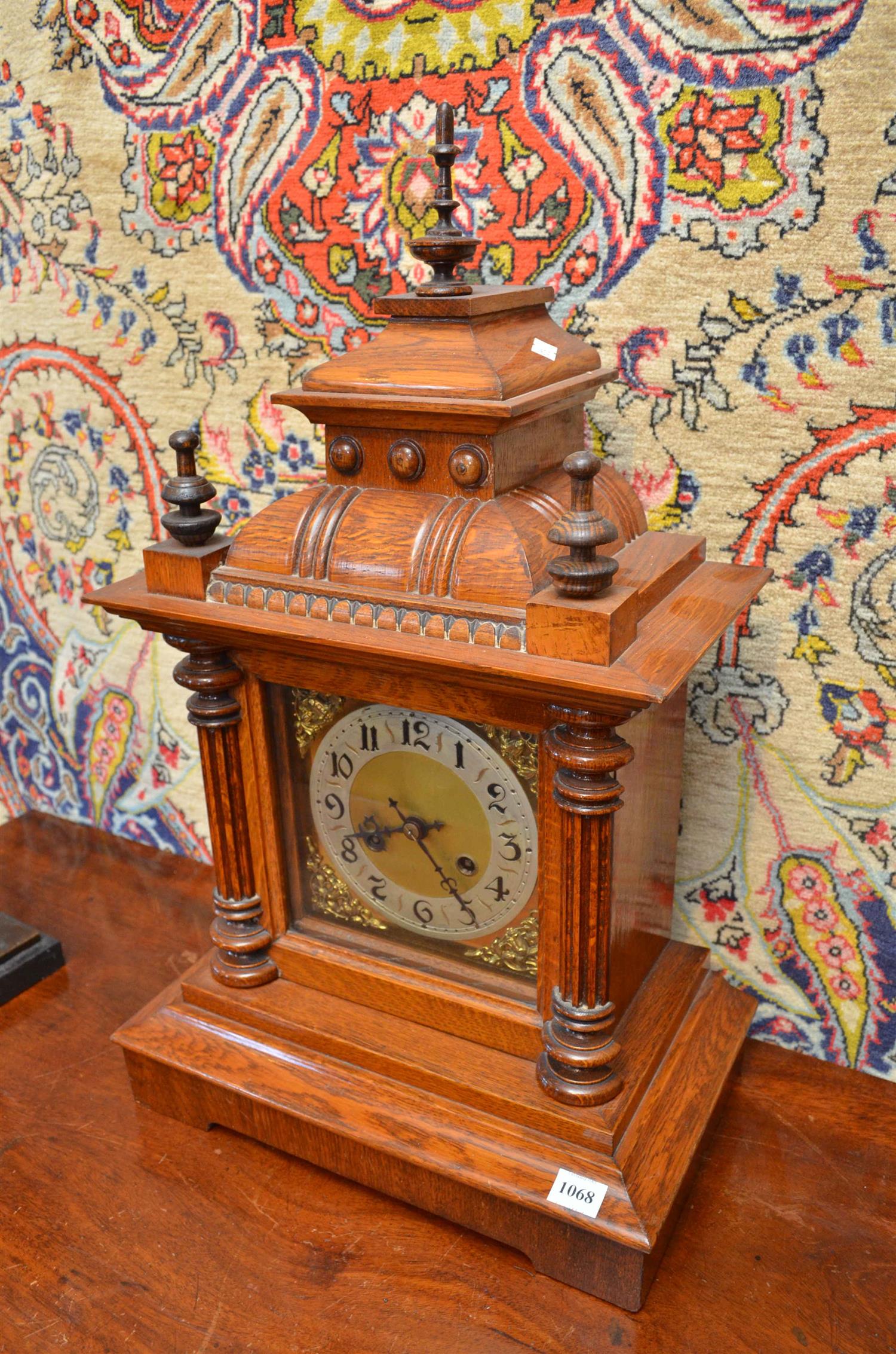 AN OAK CASED MANTLE CLOCK WITH GILT DIAL