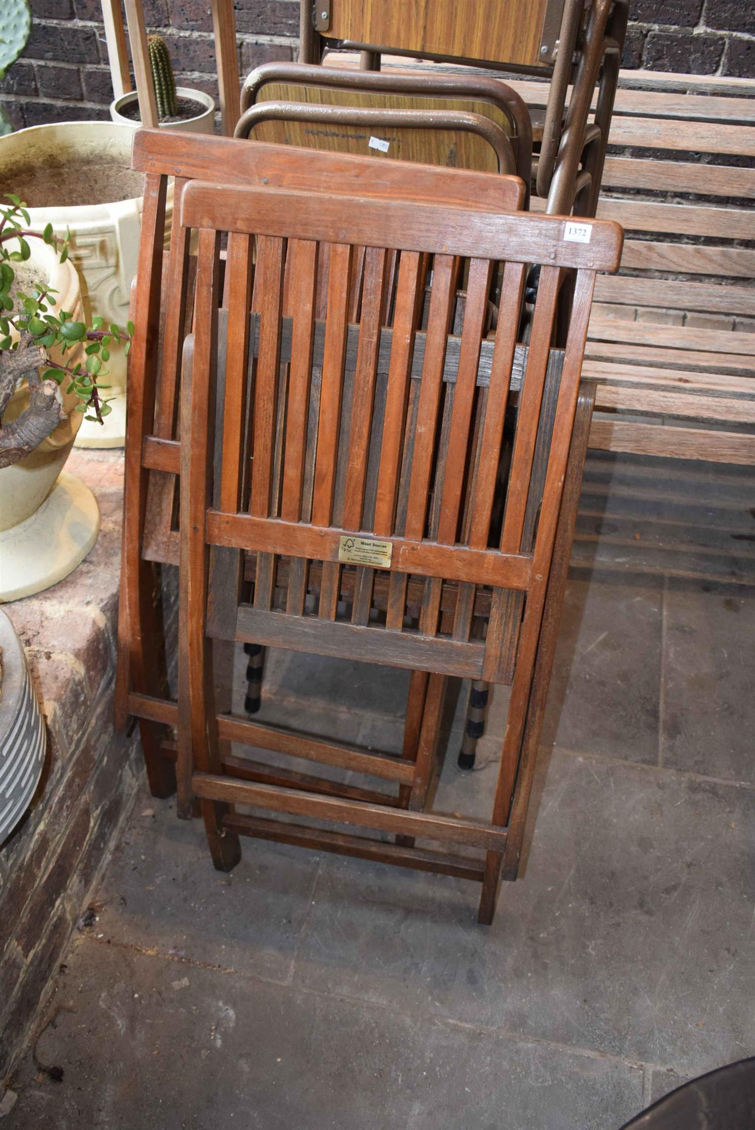 TWO TEAK FOLD UP CHAIRS AND A WROUGHT IRON SIDE TABLE