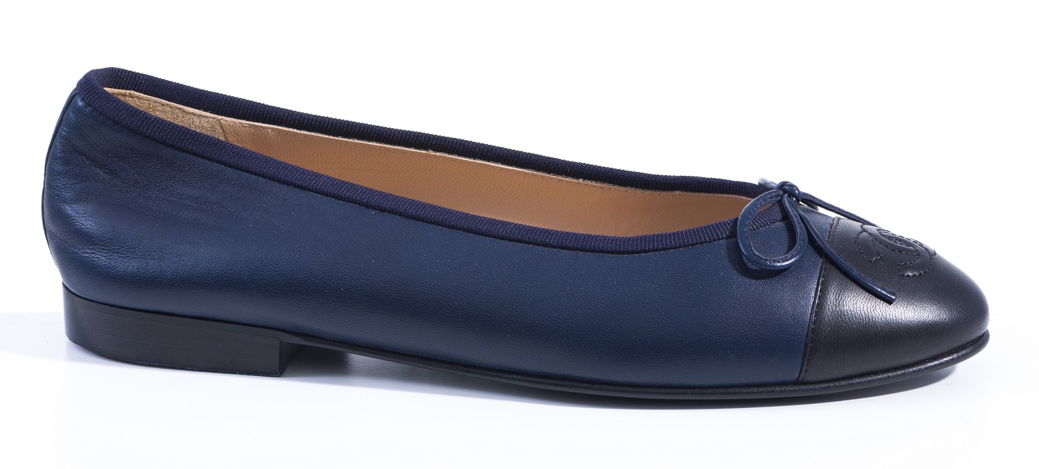 Styled in navy leather with grosgrain trim and black contrast toe, size 36, boxed.