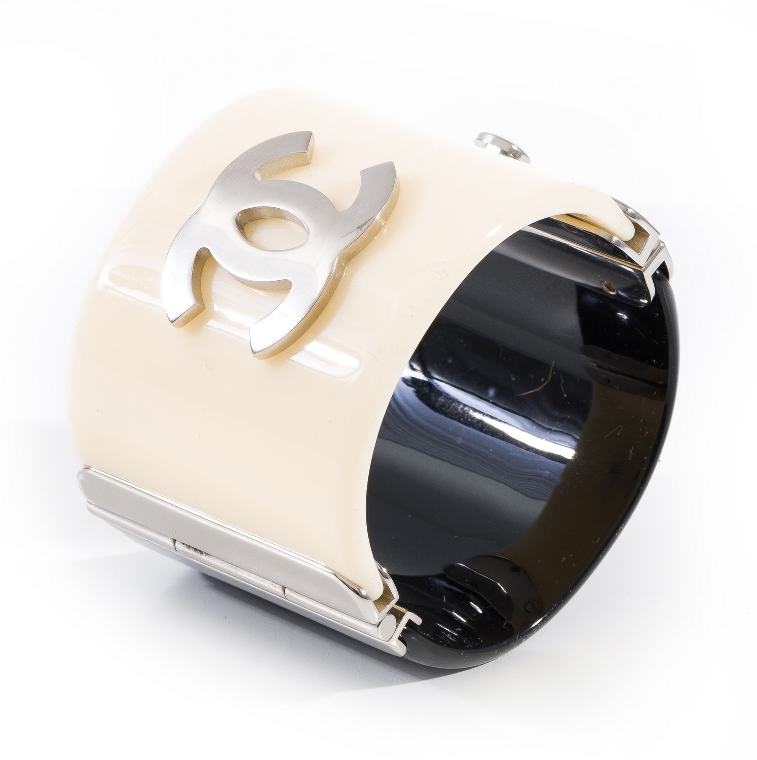 Styled in black and cream composite with silver metal CC motif, boxed.