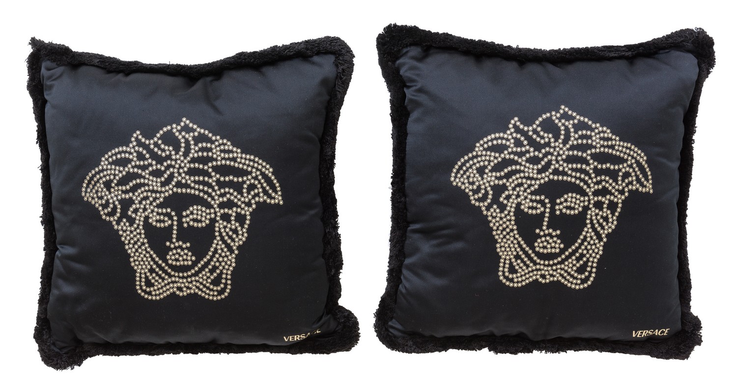Styled in black satin with fringed edge and gold embossed Medusa head logo, 42cm square.
