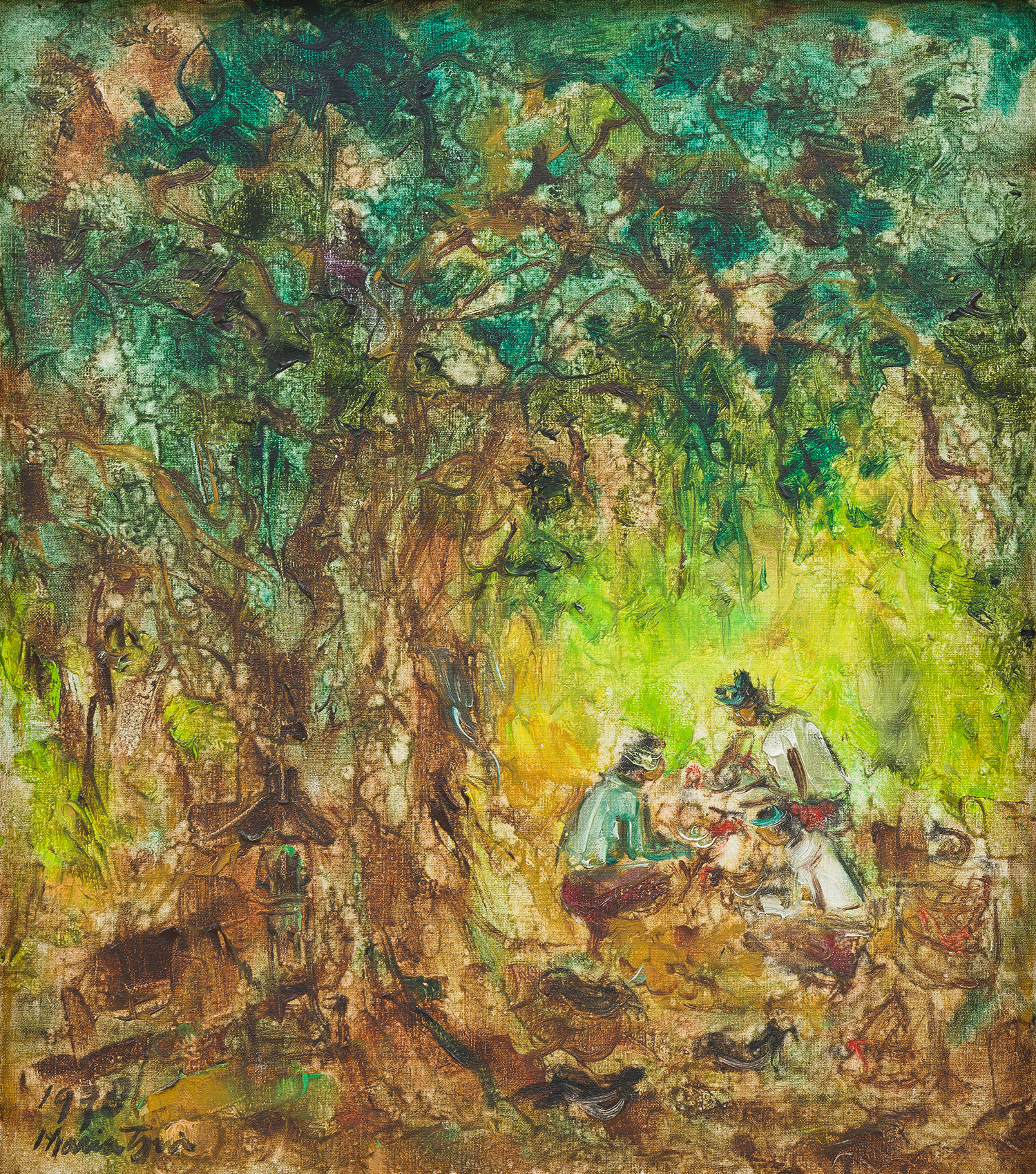 Depicting figures beneath a large tree, in thickly applied paint. In original carved Balinese wooden frame.