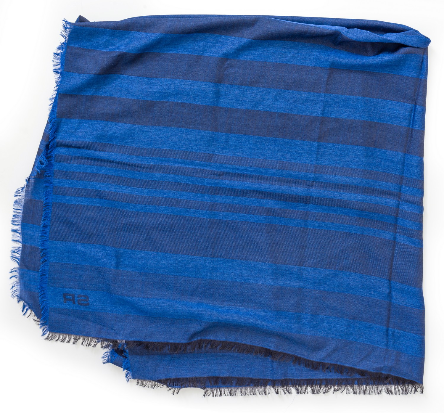 Styled in blue striped silk/wool blend with fringed edges, original tags attached, 136 x 144cm.