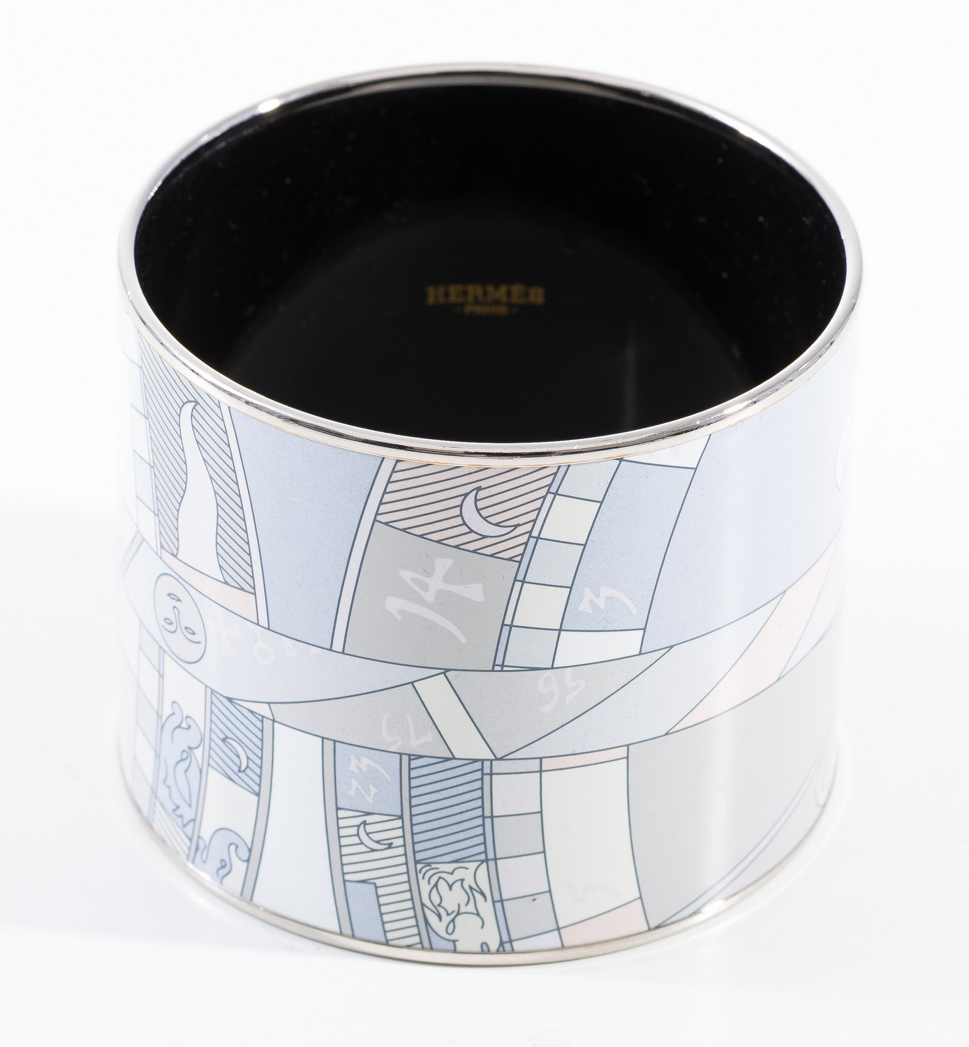 Styled in pastel print in silver metal, 5.8cm wide, 6.7cm diameter
