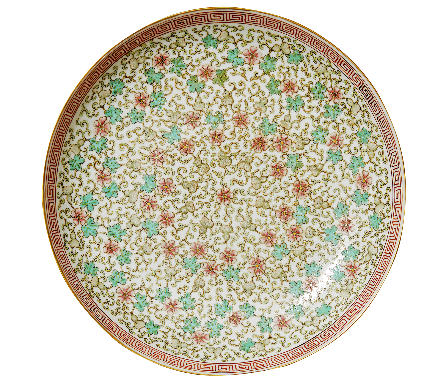 The interior and exterior covered with dense decoration of scrolling flowering and fruiting gourd vine, against a yellow ground to the exterior and a white ground to the interior. The exterior is further decorated with four roundels, each with precious objects between key-fret borders to the mouth-rim and foot-rim. Marked 'Zhangchun Tongqing' in iron red to the base, a mark used to celebrate the Chinese New Year.