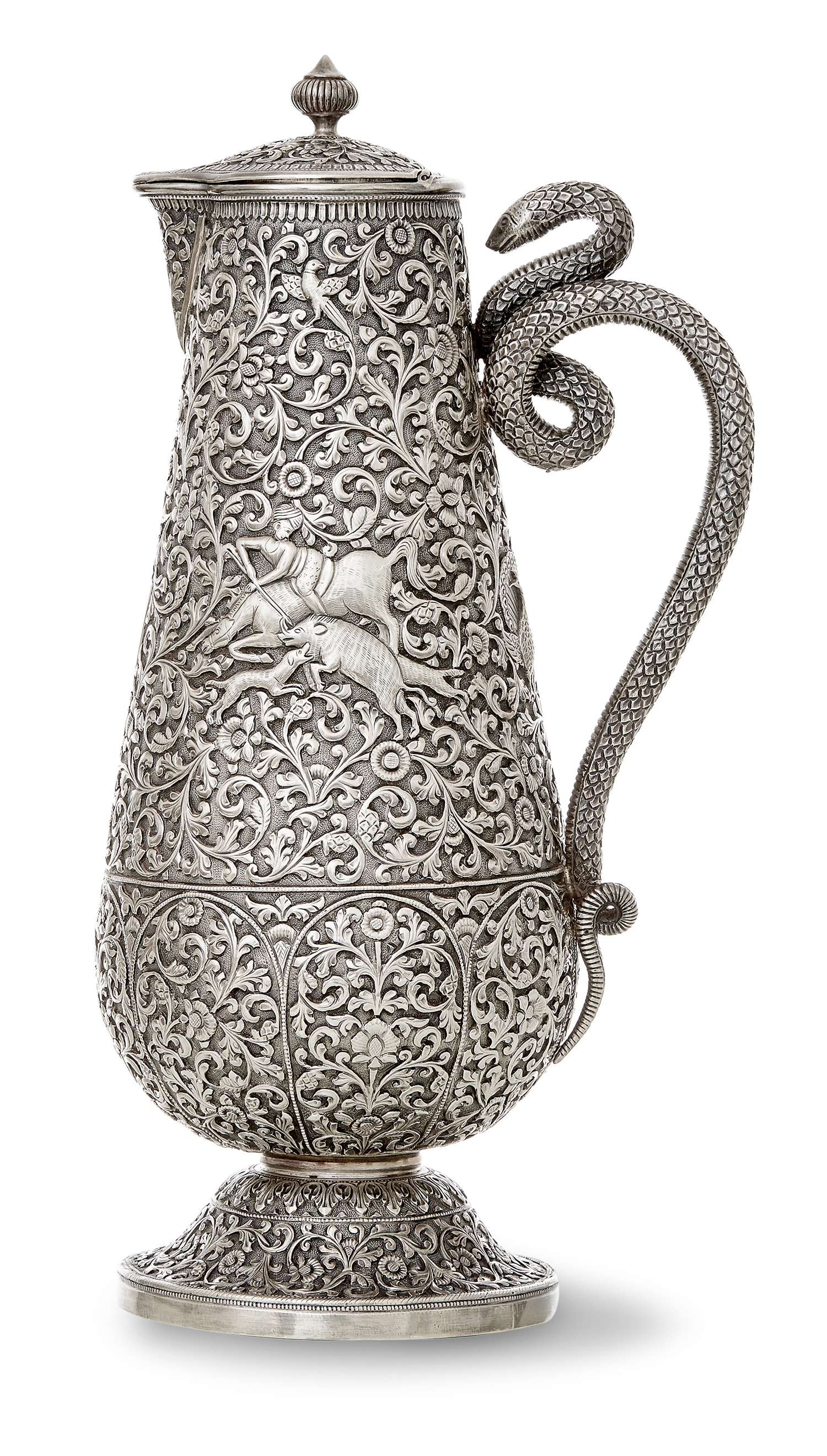 Decorated with dense scrolling foliage and flowers, the sides engraved with Persian style hunting scenes. Flanked by a well cast entwined snake form handle. Hallmarked S.M on rim of foot, for the master Cutch silversmith Shamji Mukonji.