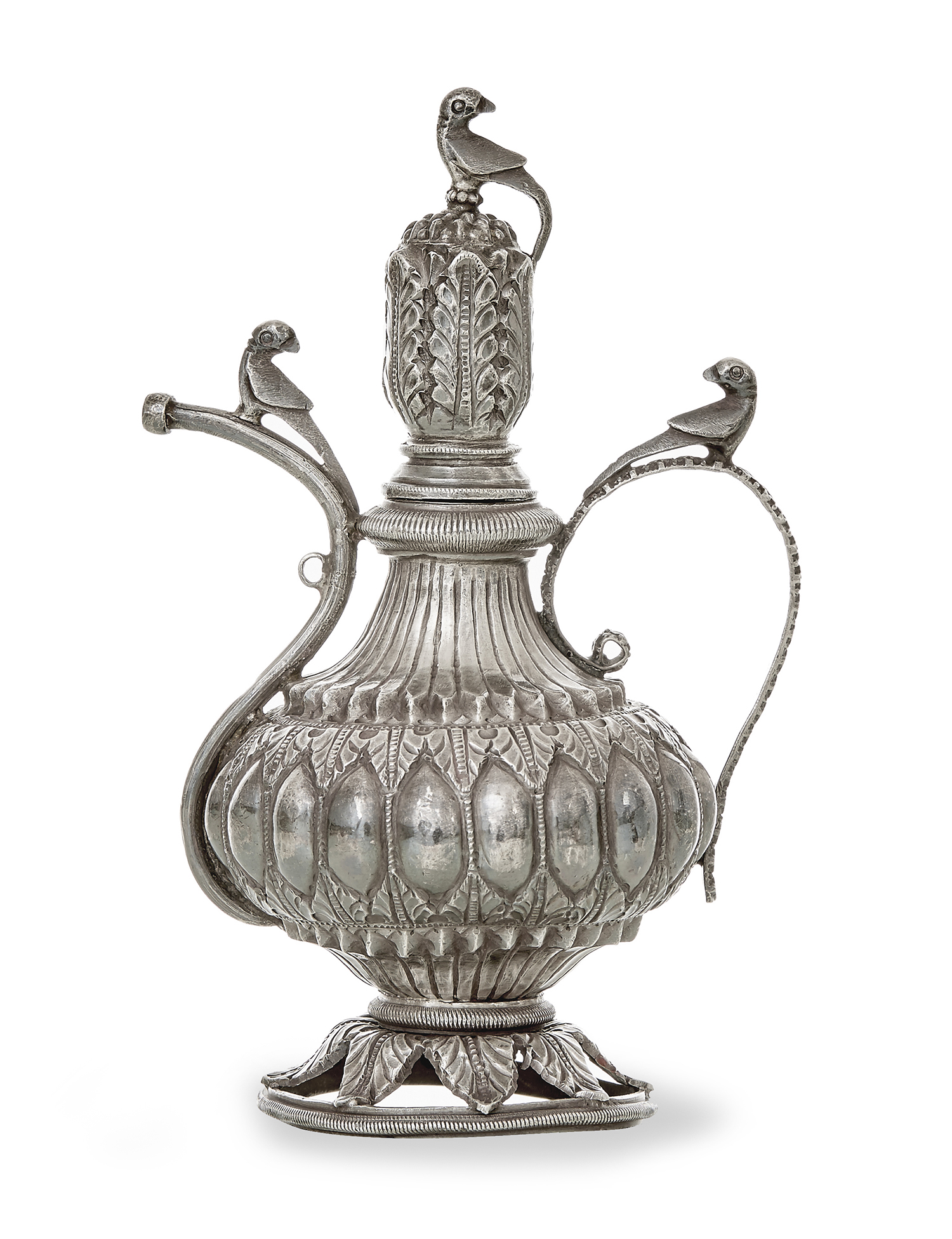 The reeded compressed globular body on a flared foot in the form of leaves resting on a ring, with delicate 'S' shaped spout, with a screw in cap of foliate form, the spout, handle and cap each surmounted by a cast silver parrot.