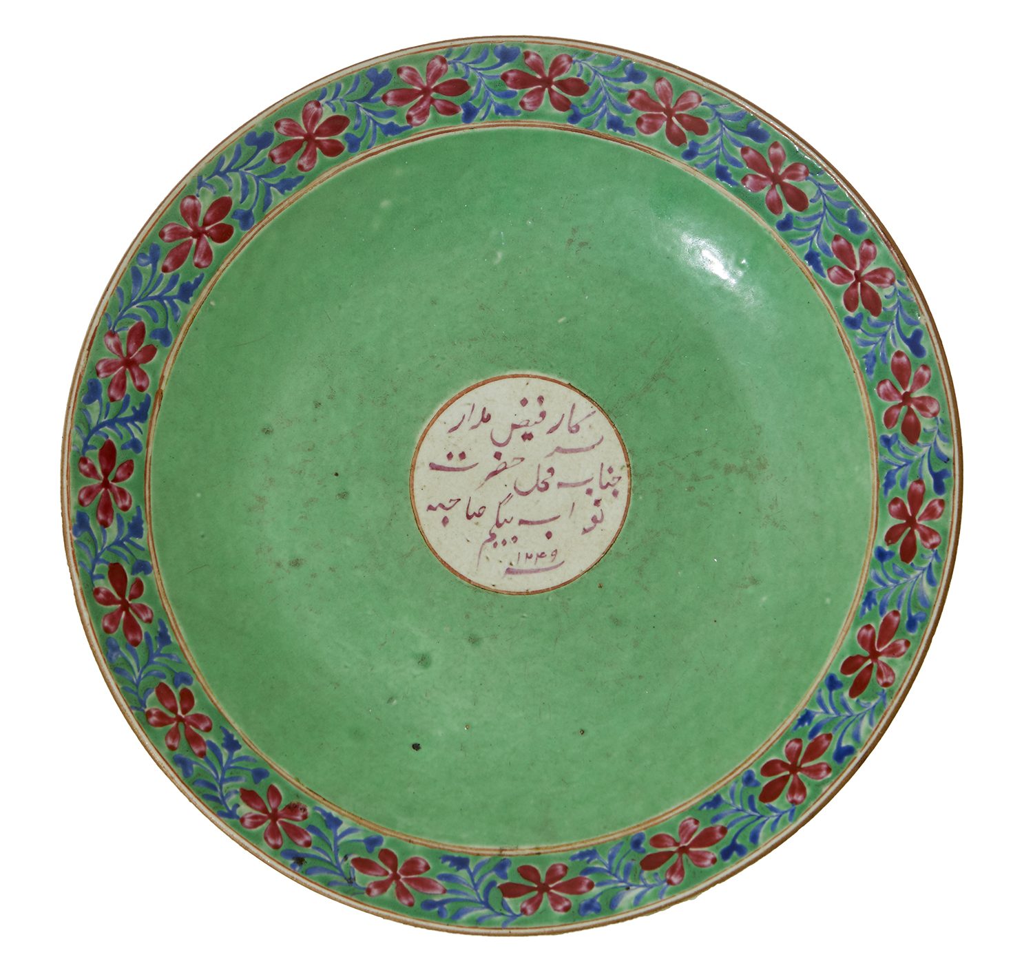 Decorated with a polychrome border of flowers and leaves against a rich, spinach-green background and with a central plaque in red with Arabic script and the year 1239 AH (approximately 1823-4 AD). The script reads 'For the Mistress of the Honoured Holy Mansion of Nawab Begum Sahiba'. Made by commission for the Indian Islamic market.