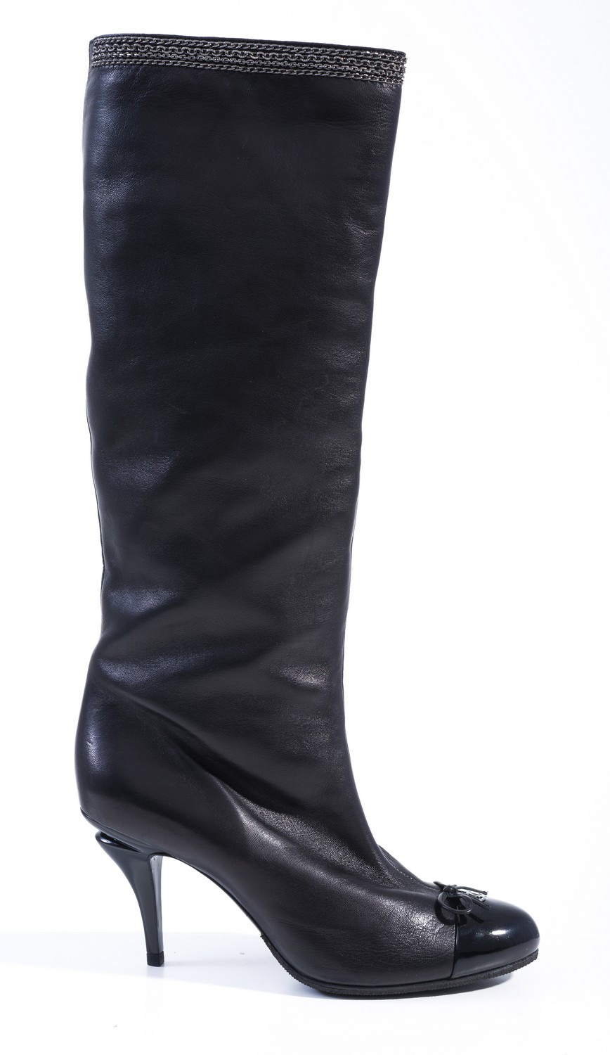 Styled in black leather, with chain detail and patent toe, size 38.5