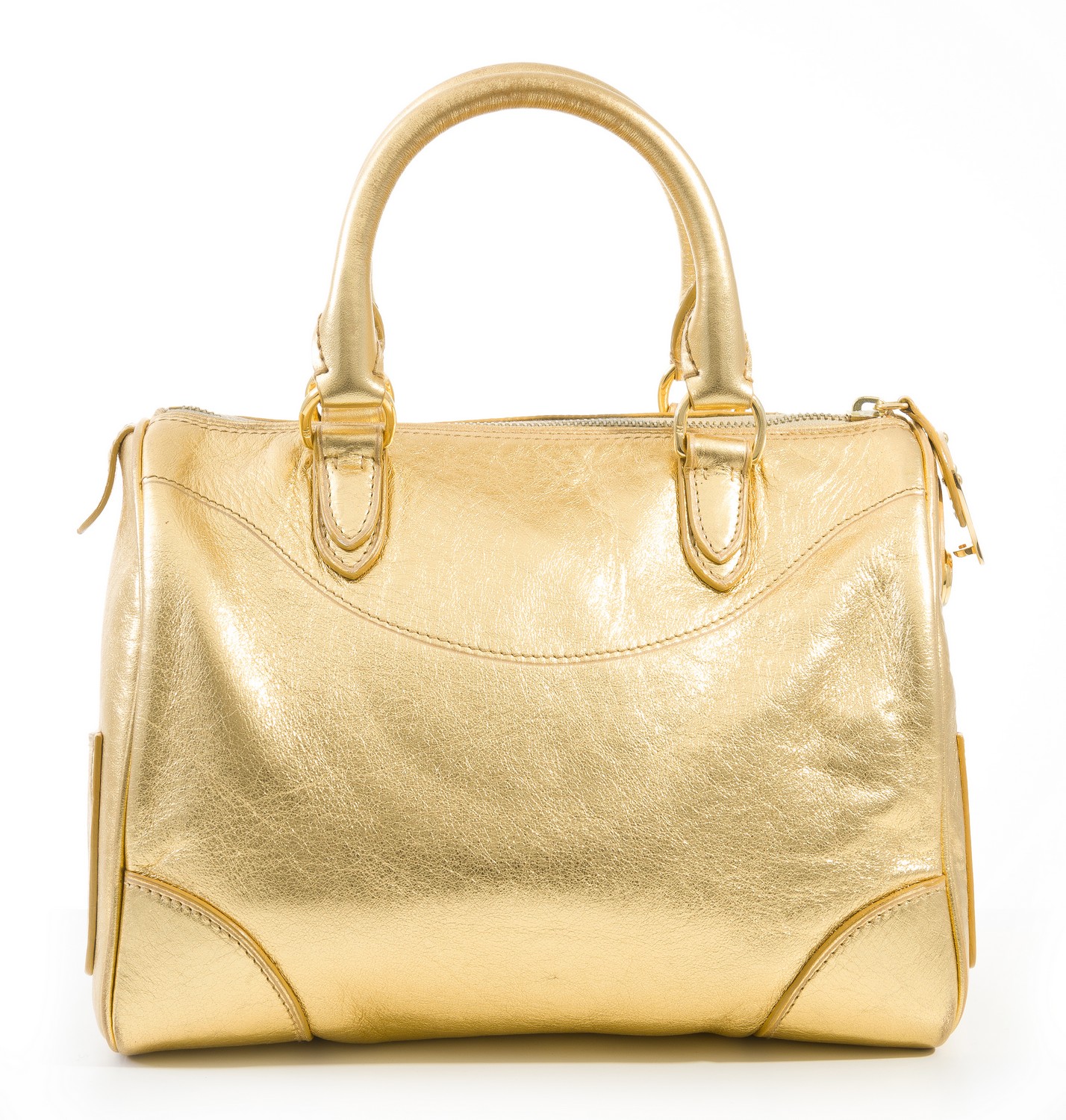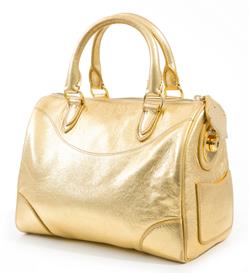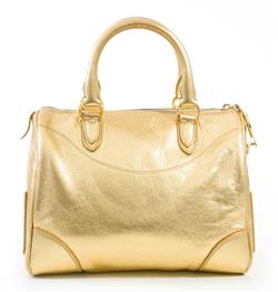 Styled in gold leather with gold metal hardware, long strap included, 20 x 24 x 14cm.