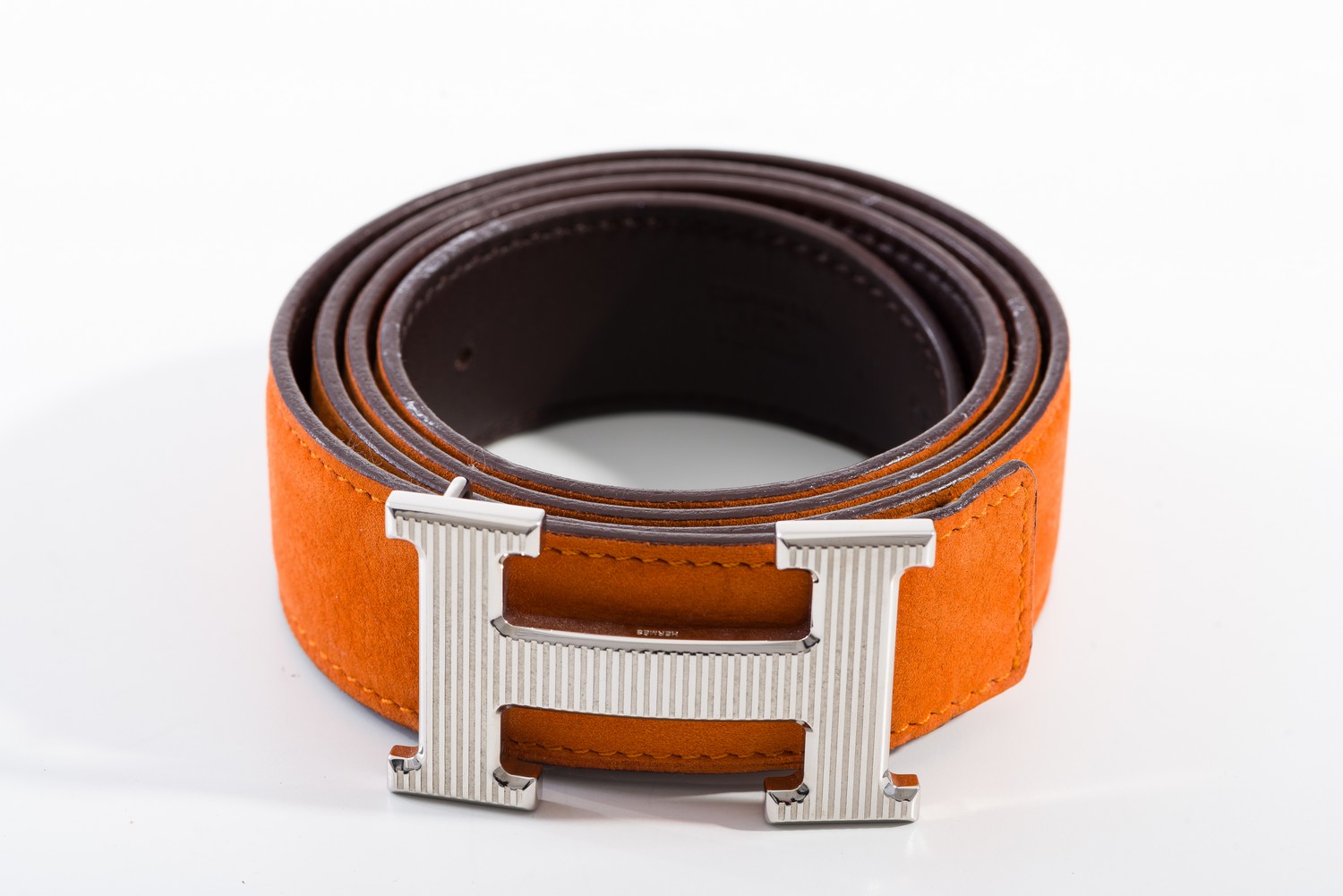 Styled in orange suede with silver metal 'H' clasp, labelled size 85, boxed.