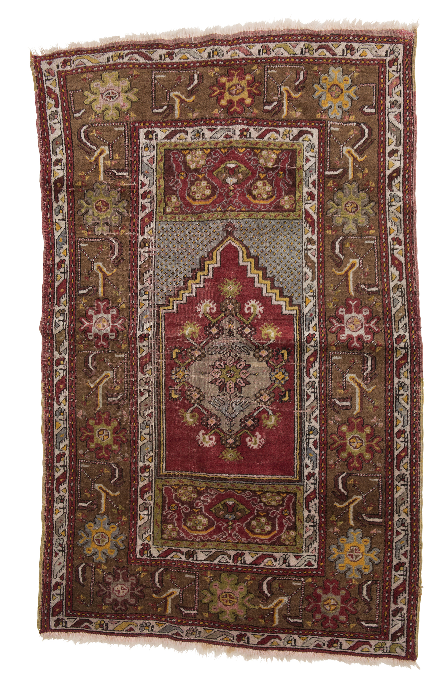 Decorated with a central large gul within a red mihrab shaped field, within a wide border with scrolling flowers.