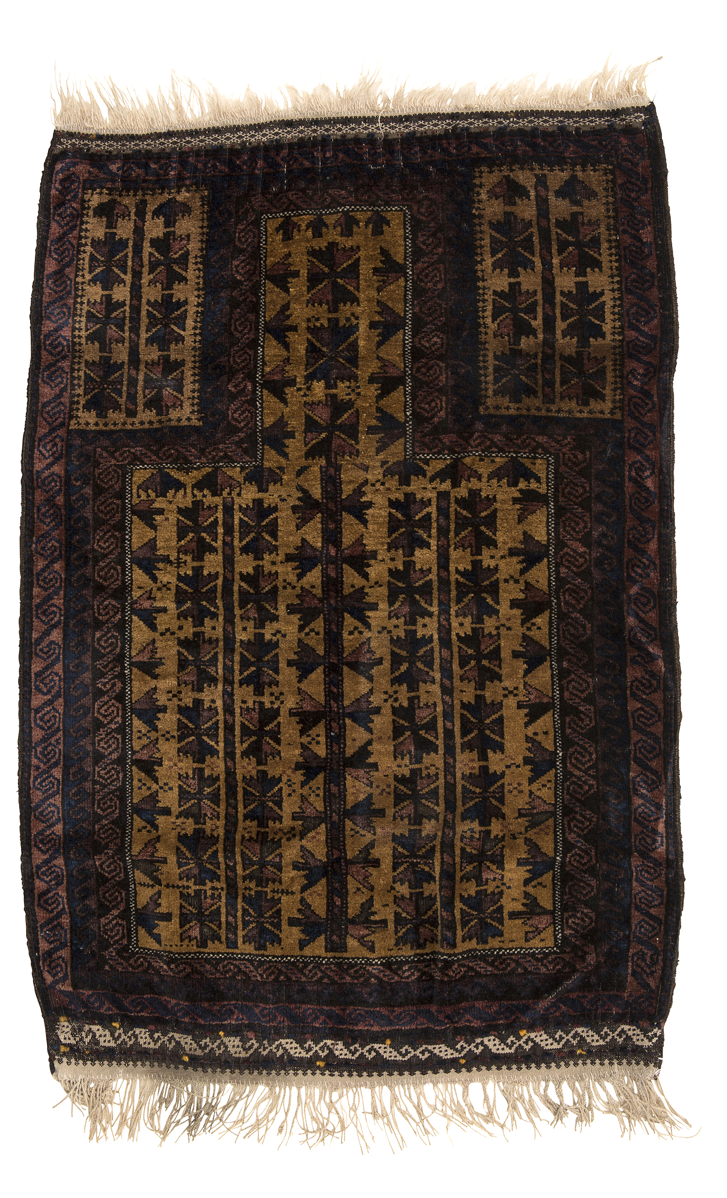 The central field of camel-coloured wool with repeating stylised flowers forms within a stepped rectangular mihrab shape, the outer borders of continuous 's' and wave designs, with kilim and fringe ends.
