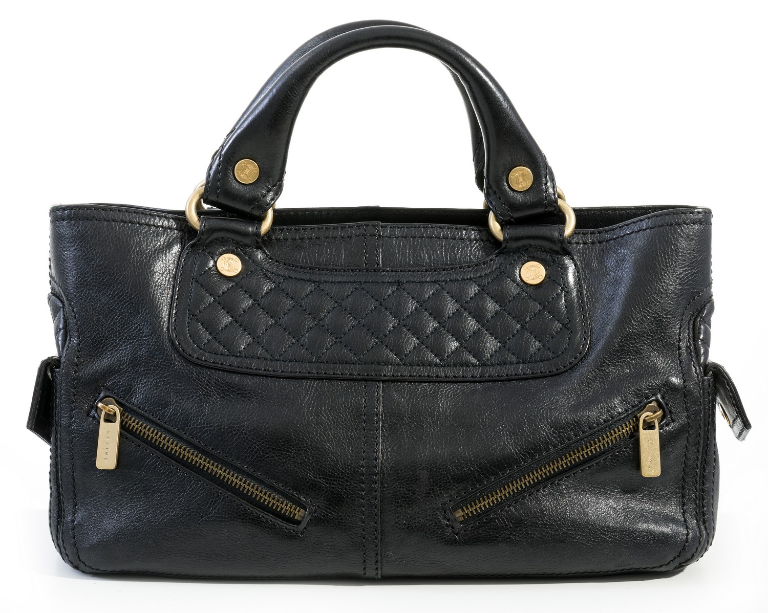 Styled in black leather with gold metal hardware, 19 x 32 x 14cm.