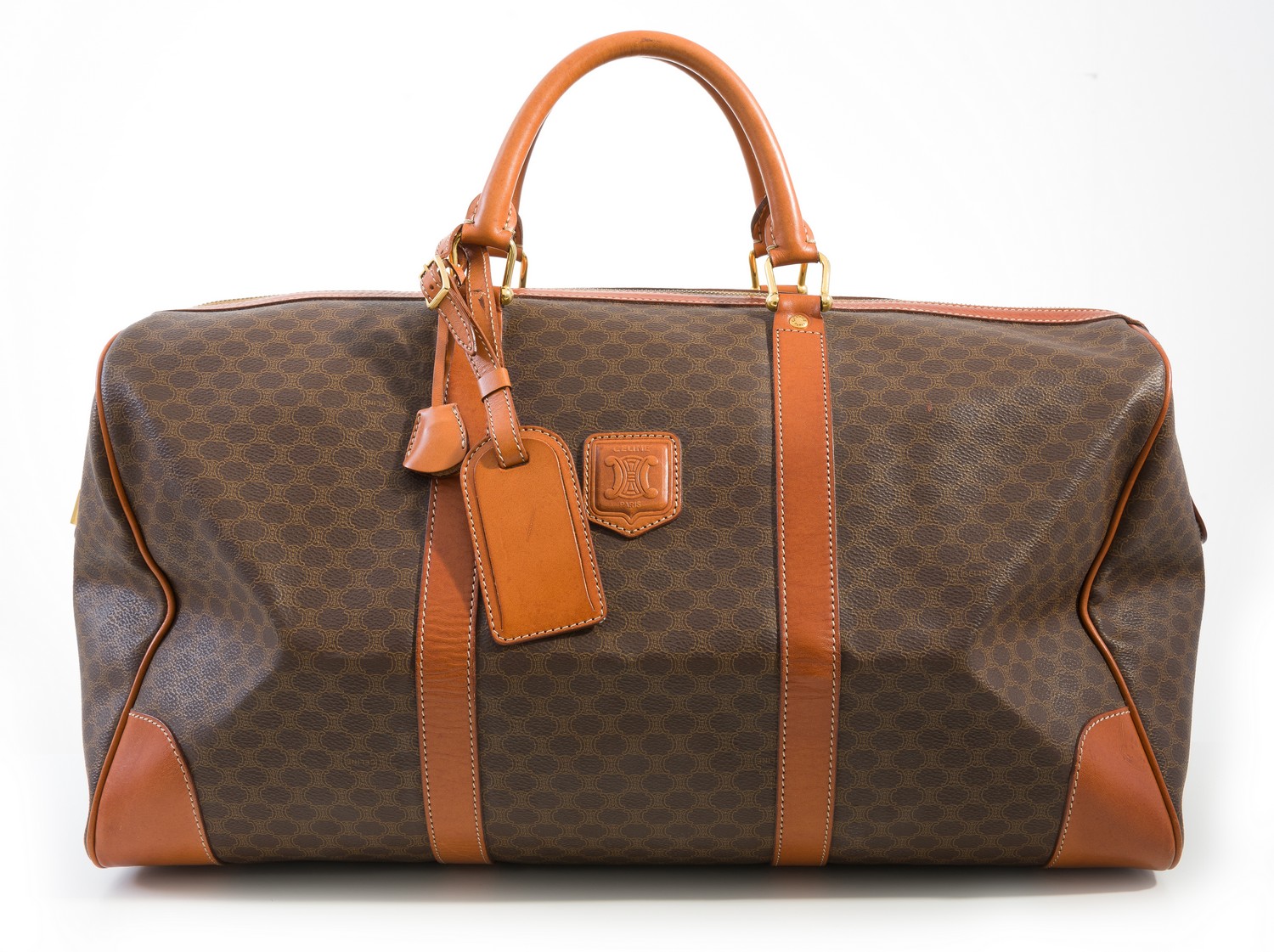 Styled in brown coated canvas with tan leather trim and gold metal hardware, 37 x 49 x 22.