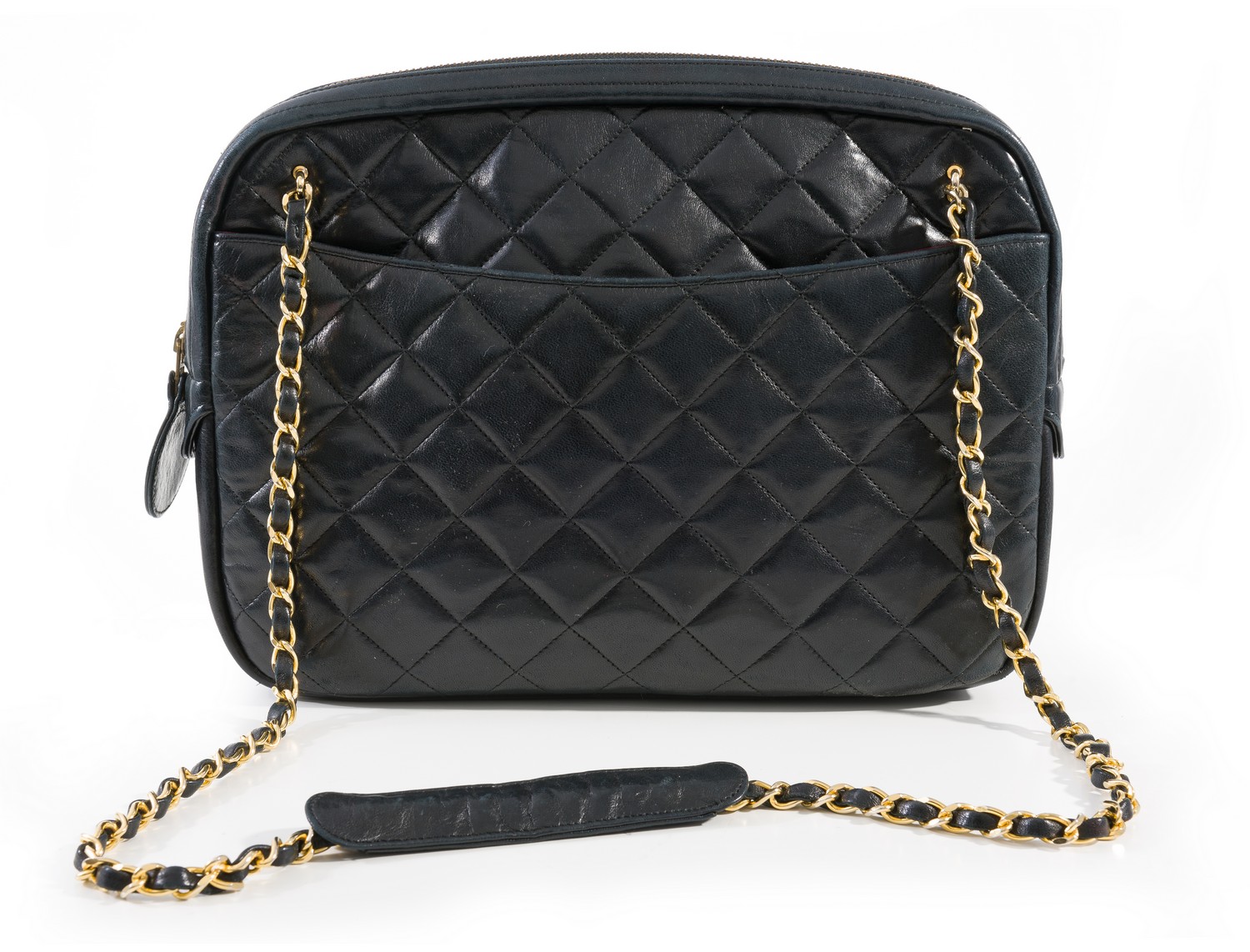 Styled in black quilted leather with gold metal hardware, 22 x 37 x 6cm.
