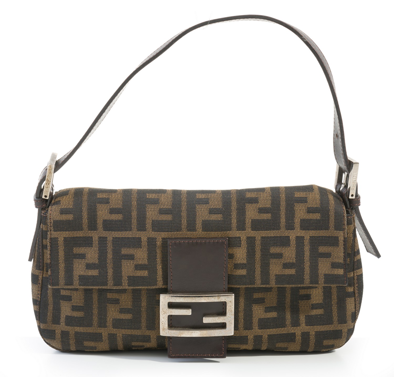 Styled in brown canvas with brown leather trim and silver hardware, serial number 2321-26424-009, 15 x 25 x 4cm.