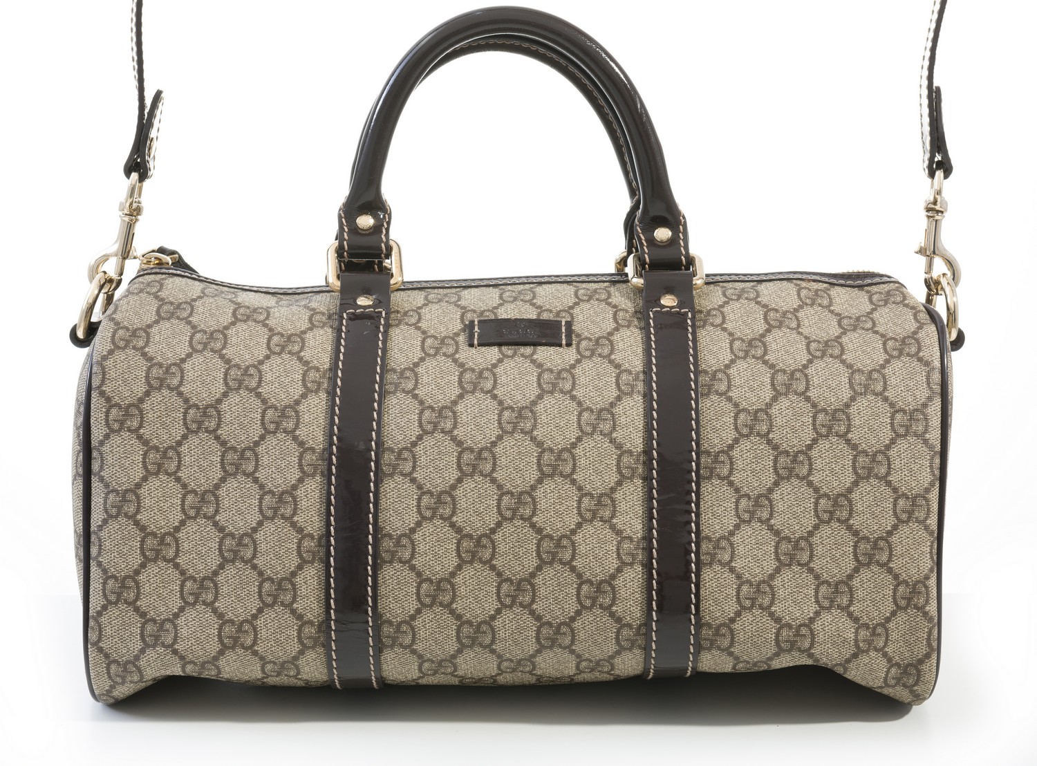 Styled in beige guccissima canvas with brown patent leather trim and gold metal hardware, 20 x 32 x 17cm.