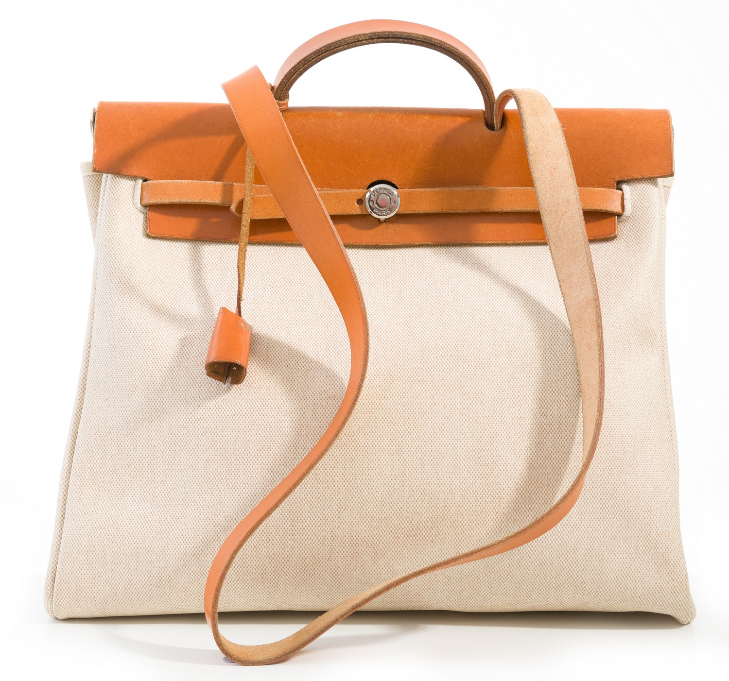 Styled in barenia leather and silver metal hardware with interchangeable beige coated canvas bags in small and large size, stamped B in a square, circa1998.