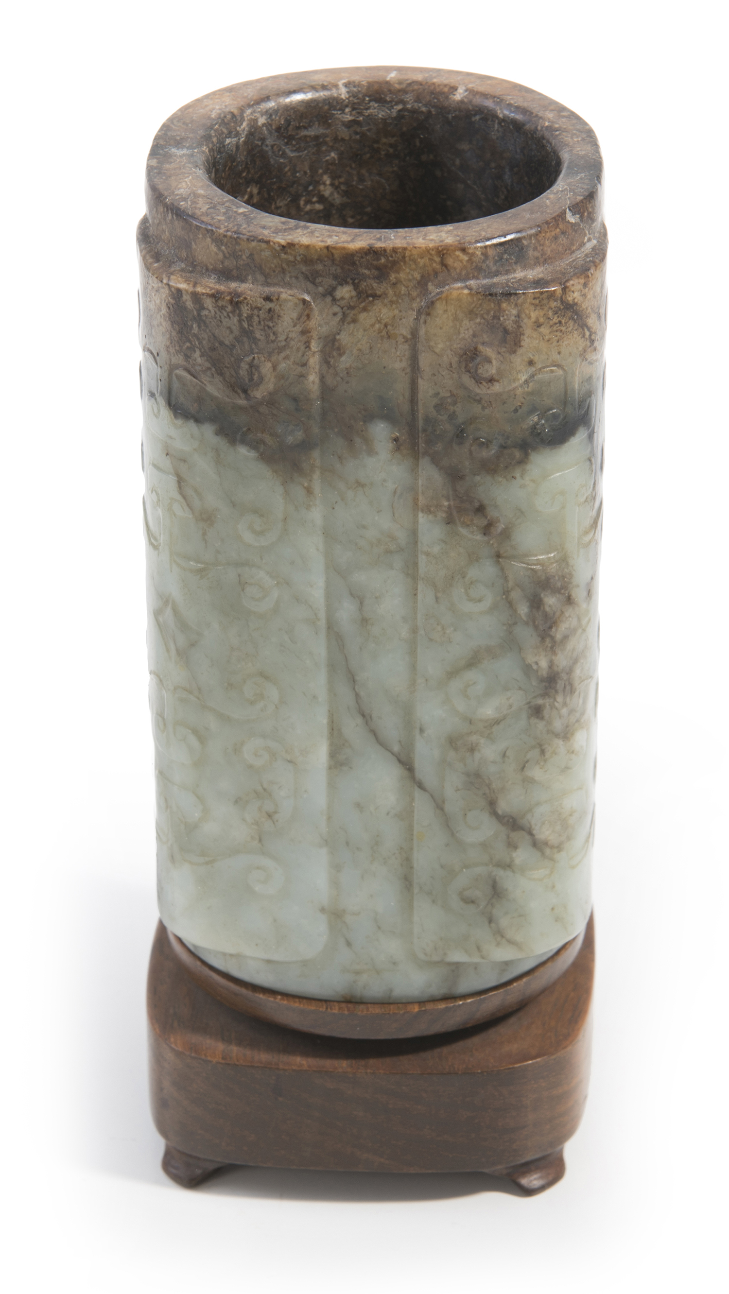 The colour of the cong ranging from pale celadon to brown and russet, carved with archaistic motifs including spirals. Together with a fitted wooden stand and old padded box, and original receipt.