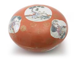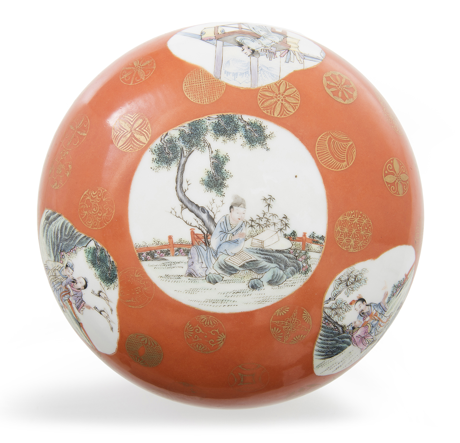 The large round porcelain covered bowl/box decorated with shaped reserves featuring famille rose decorated vignettes of scholars with attendants in gardens, against an iron red ground with gilded decoration of brocade balls. Apocryphal six character Qianlong mark in iron red enamel to the base.