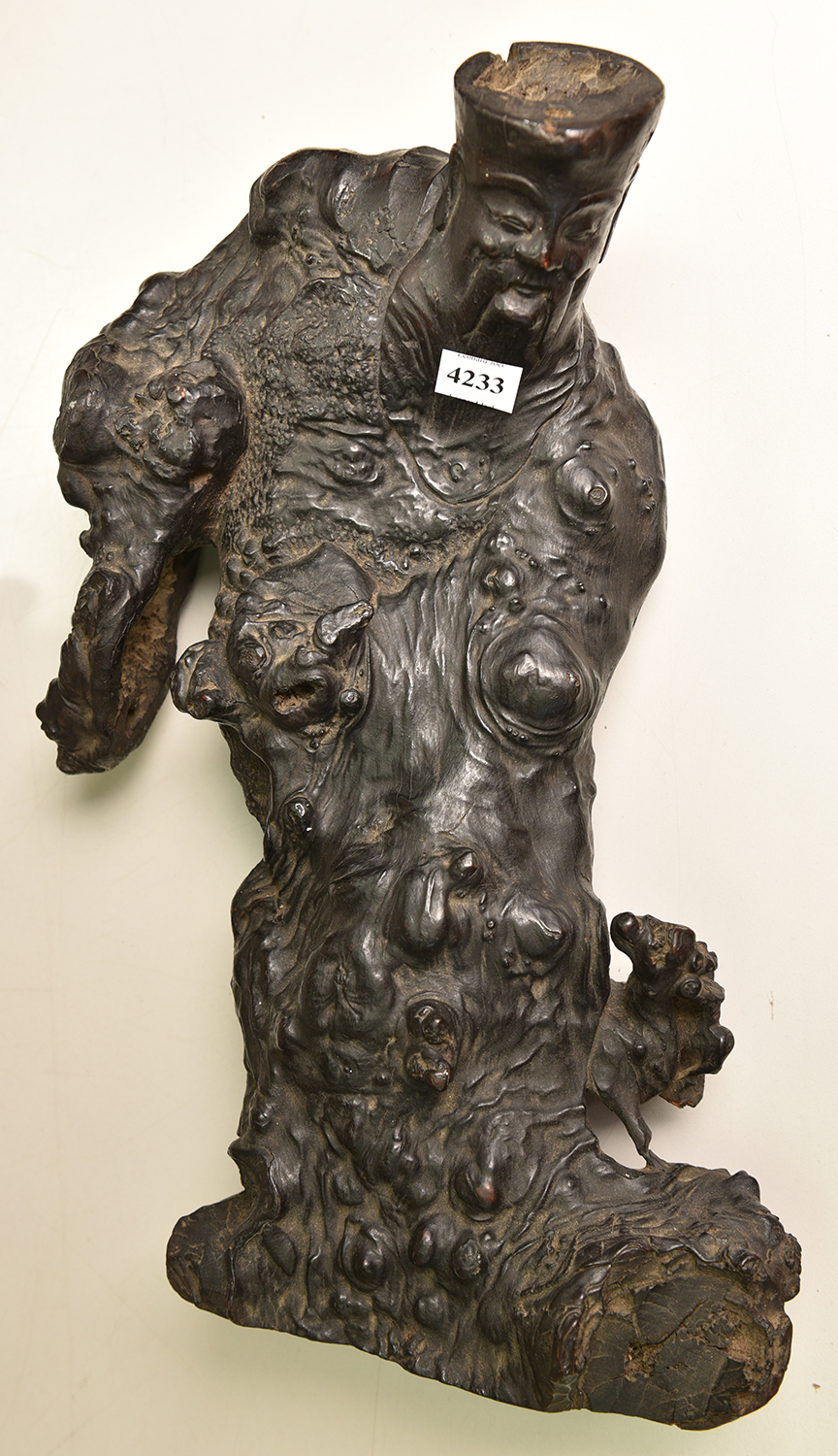 Carved from dense hardwood burl, the rootwood formations suggesting flowing robes, with a minimally carved natural protuberance behind the figure suggesting a qilin.
