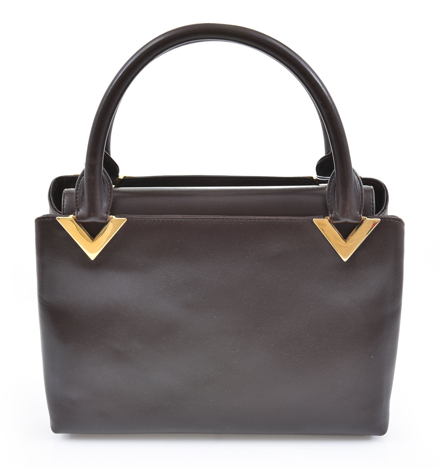 Styled in chocolate brown calfskin leather with gold metal features, 19 x 26 x 9cm, boxed.