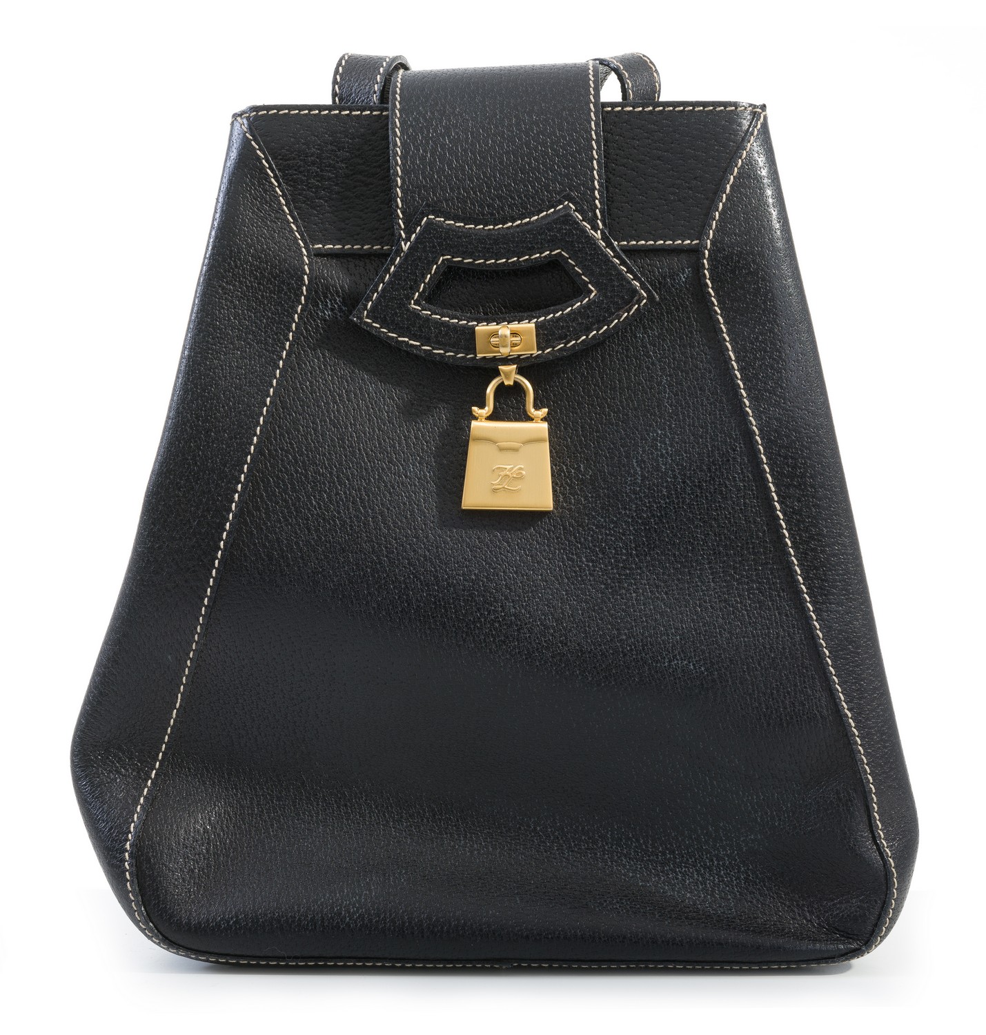 Styled in black leather with white contrast stitching and brushed gold metal hardware, 29 x 27 x 14cm, boxed.