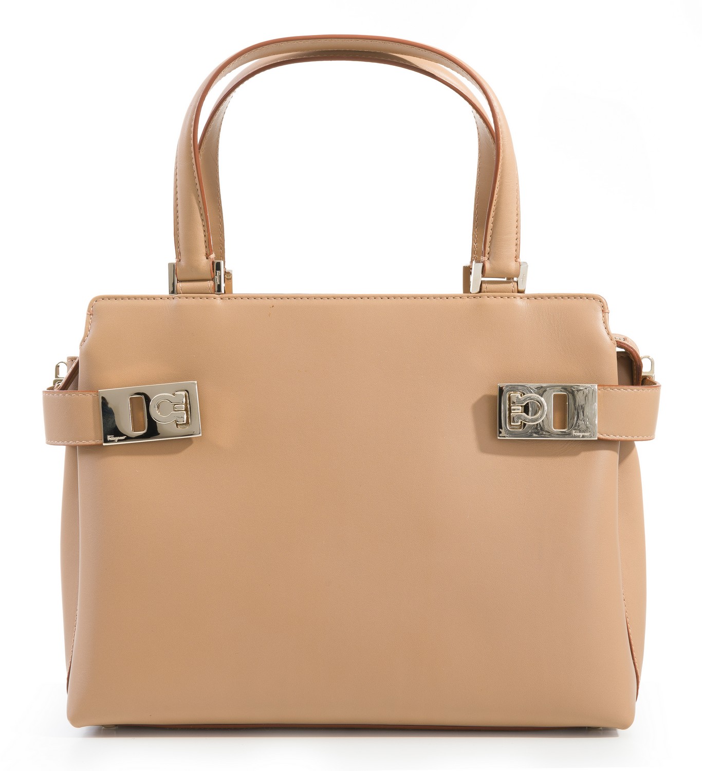 Styled in sand calfskin with silver metal hardware, 20 x 26 x 9cm, boxed.