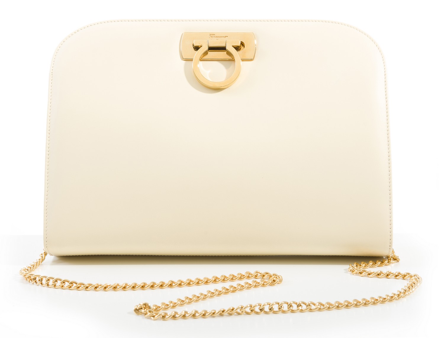 Styled in cream leather with gold metal hardware and long metal chain strap, 20 x 28 x 5cm, boxed.