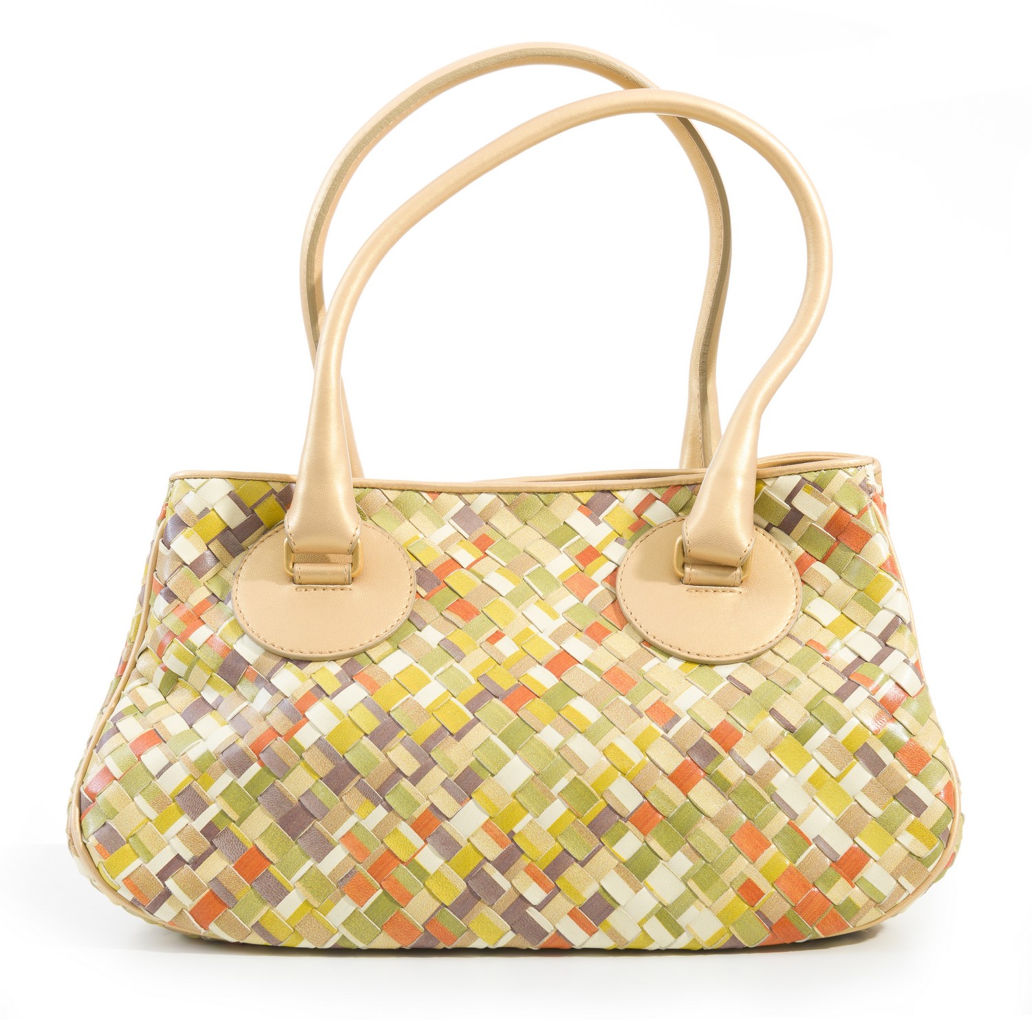 Styled in multicoloured Intrecciato leather with metallic gold handles and brushed gold metal hardware, 16 x 29 x 18cm.