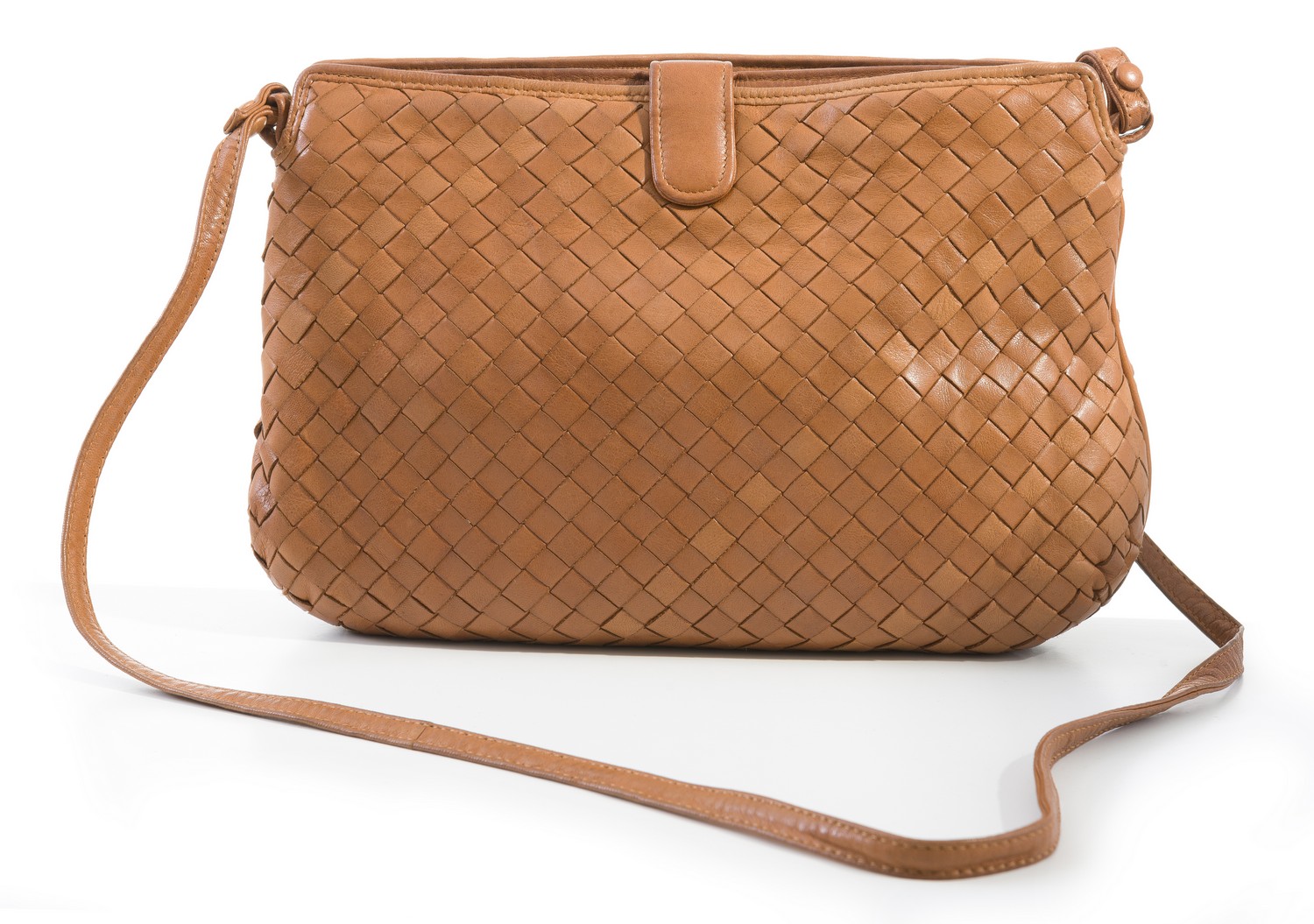 Styled in tan Intrecciato leather, 19.5 x 26 x 5cm.