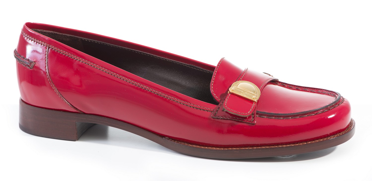 Styled in red patent leather with gold metal hardware, size 35.5, boxed.