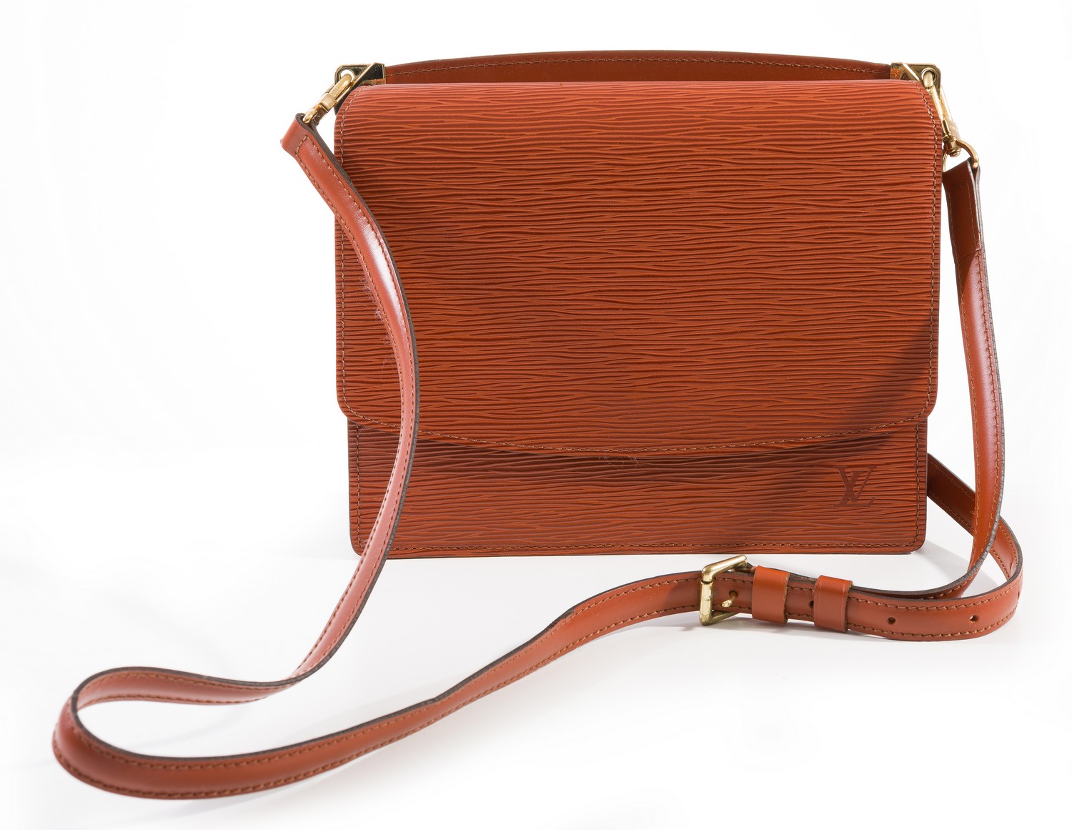 Styled in tan Epi leather with gold metal hardware, 21 x 24 x 9cm, boxed.