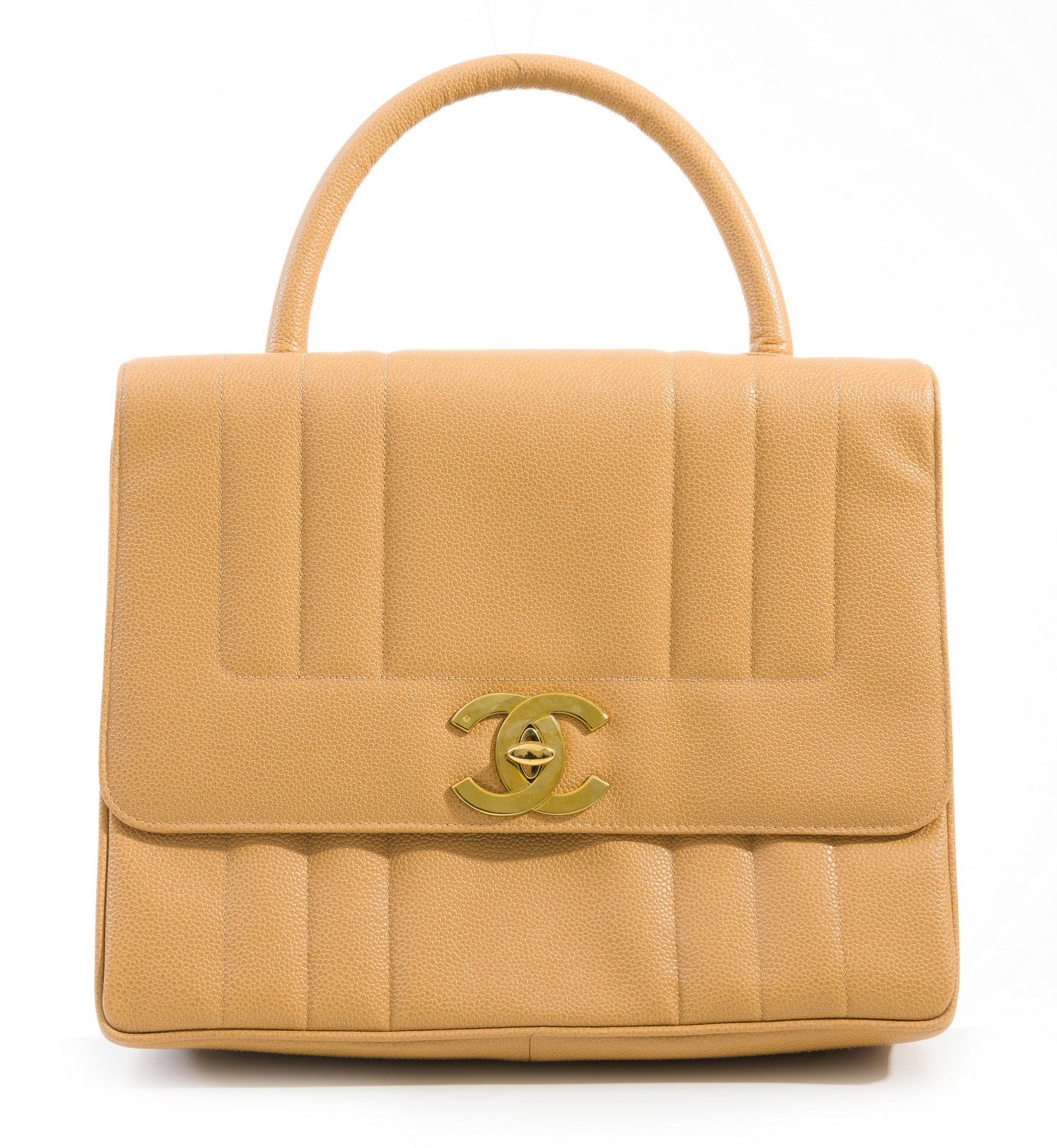 Styled in camel caviar leather with gold metal CC clasp, authenticity card no. 3276723, 24 x 31 x 9cm.
