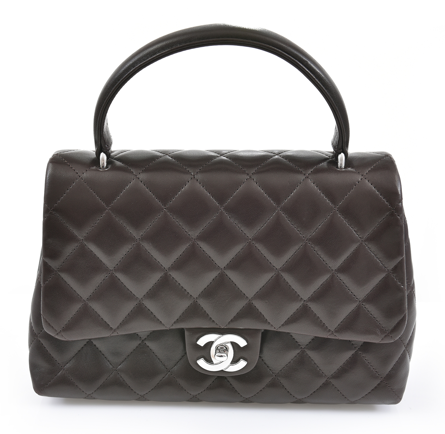 Styled in chocolate calfskin leather with silver metal clasp, reference card no.10103397, 18.5 x 27 x 6cm.