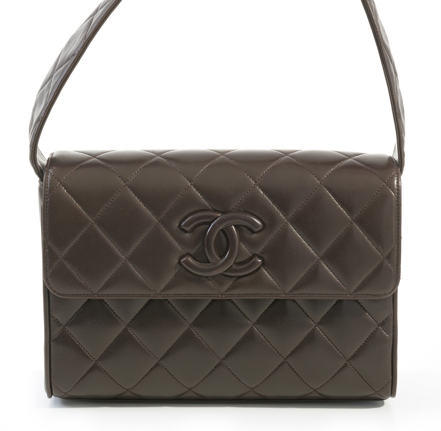 Styled in chocolate calfskin leather with leather CC clasp, reference card no. 2495400, 16 x 24 x 6cm, boxed.