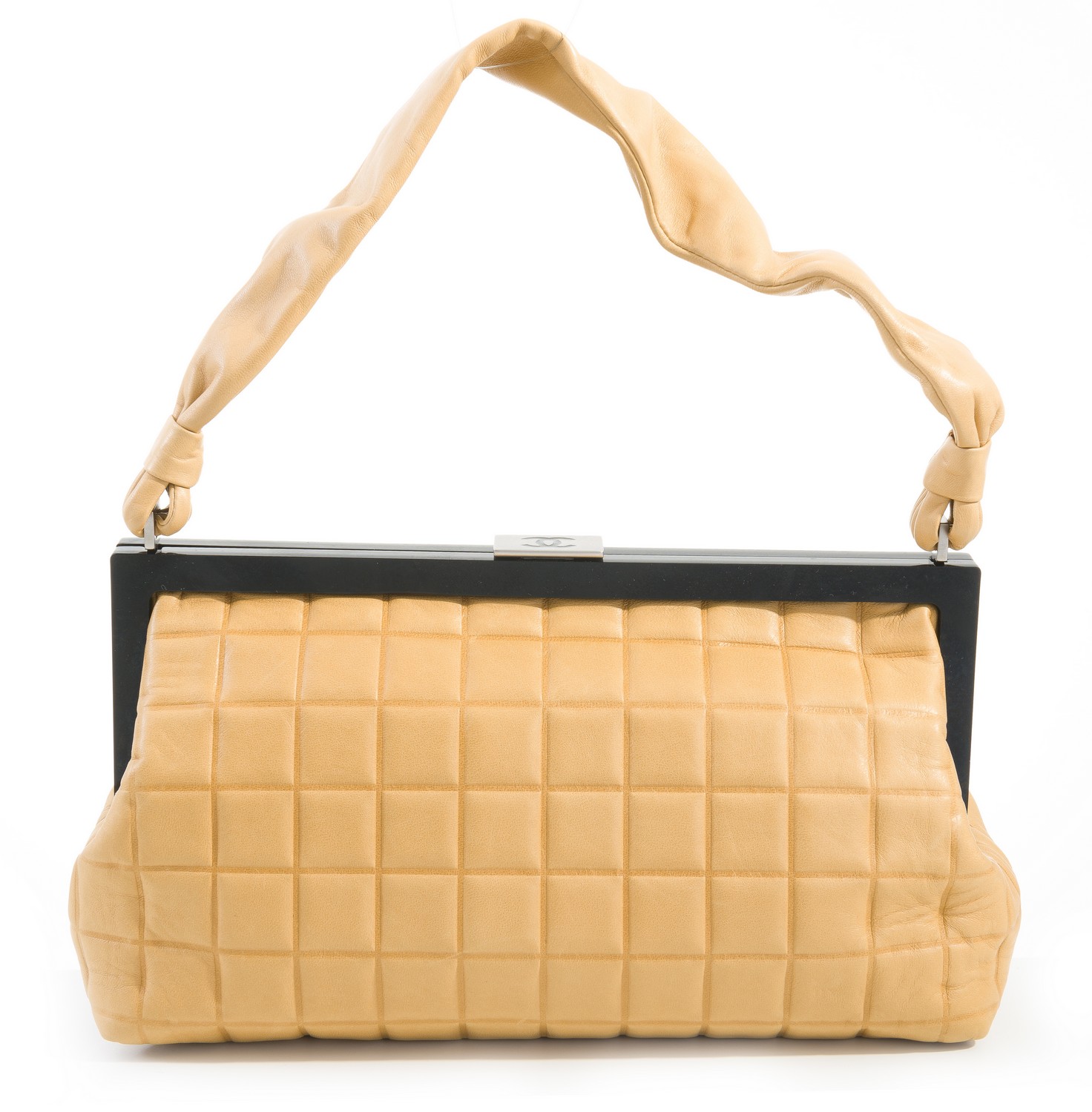 Styled in camel leather with resin and silver metal clasp, reference card number 7473503, 19 x 32 x 10cm.
