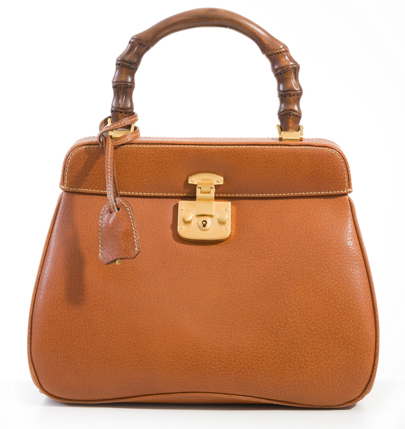 Styled in tan leather with bamboo handle and gold metal hardware, 22 x 29 x 13cm.