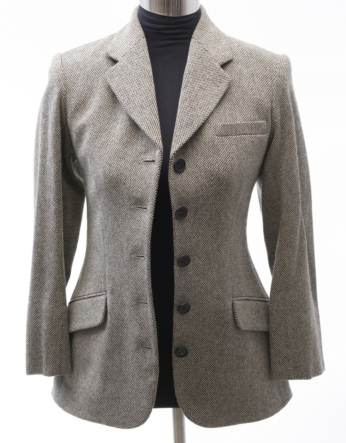 Styled in tweed wool/cashmere blend, labelled size FR38.