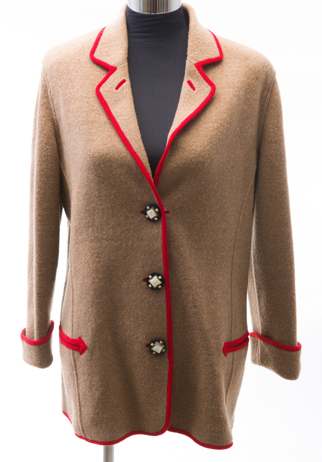 Styled in camel wool with red trim and embellished buttons, labelled size M.