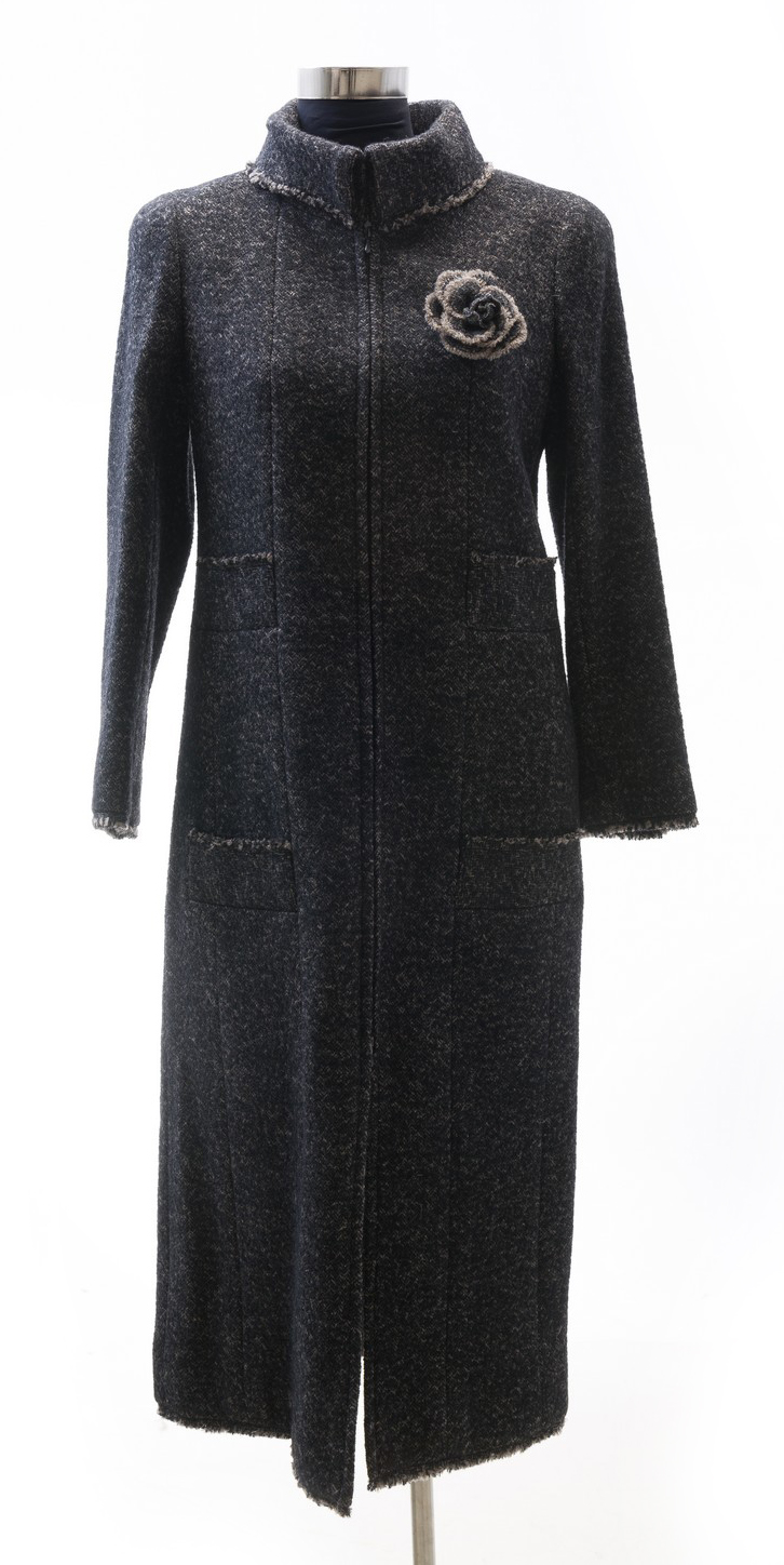 Styled in grey wool blend, with detachable flower brooch, labelled size FR38.