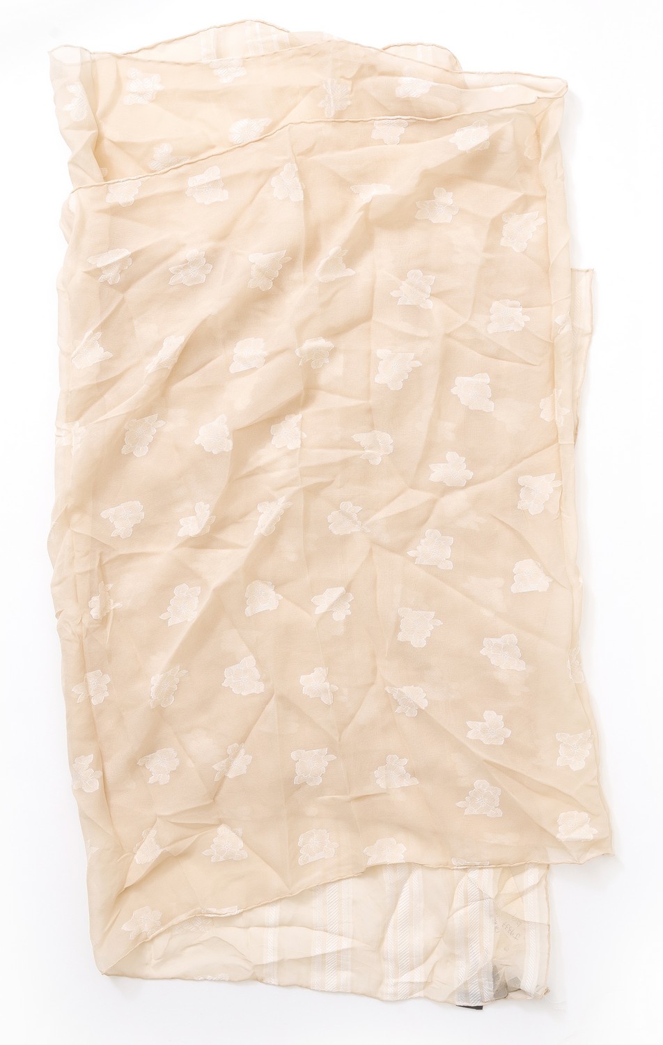 Styled in cream silk with floral pattern,132 x 87cm, original tags attached.