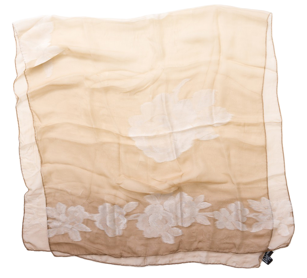 Styled in beige silk with floral pattern, 140 x 70cm.