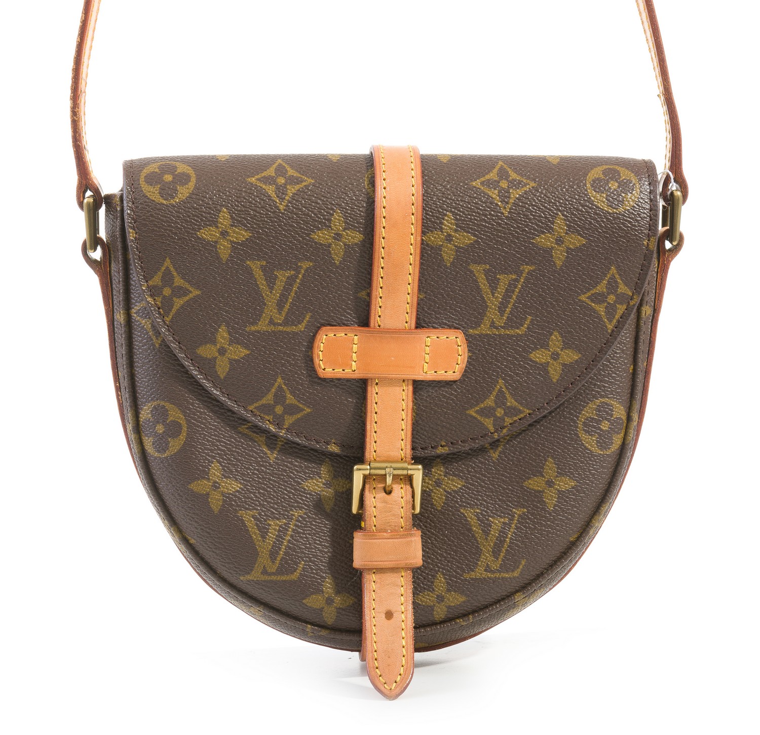 Styled Monogram canvas with tan leather trim and gold metal hardware, 17 x 19 x 6cm.