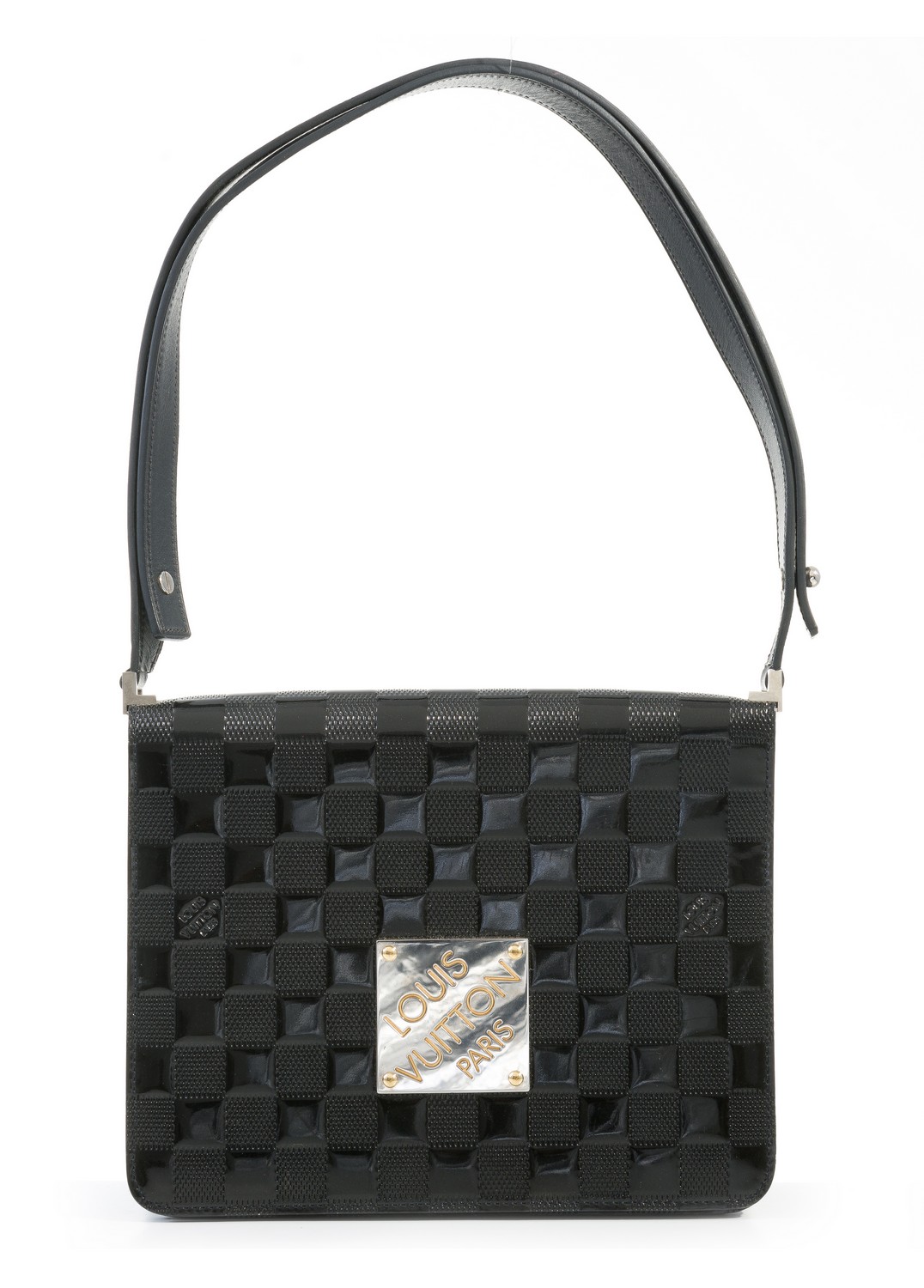 Styled in black Damier Vernis leather with silver metal hardware, 18 x 22.5 x 6cm.