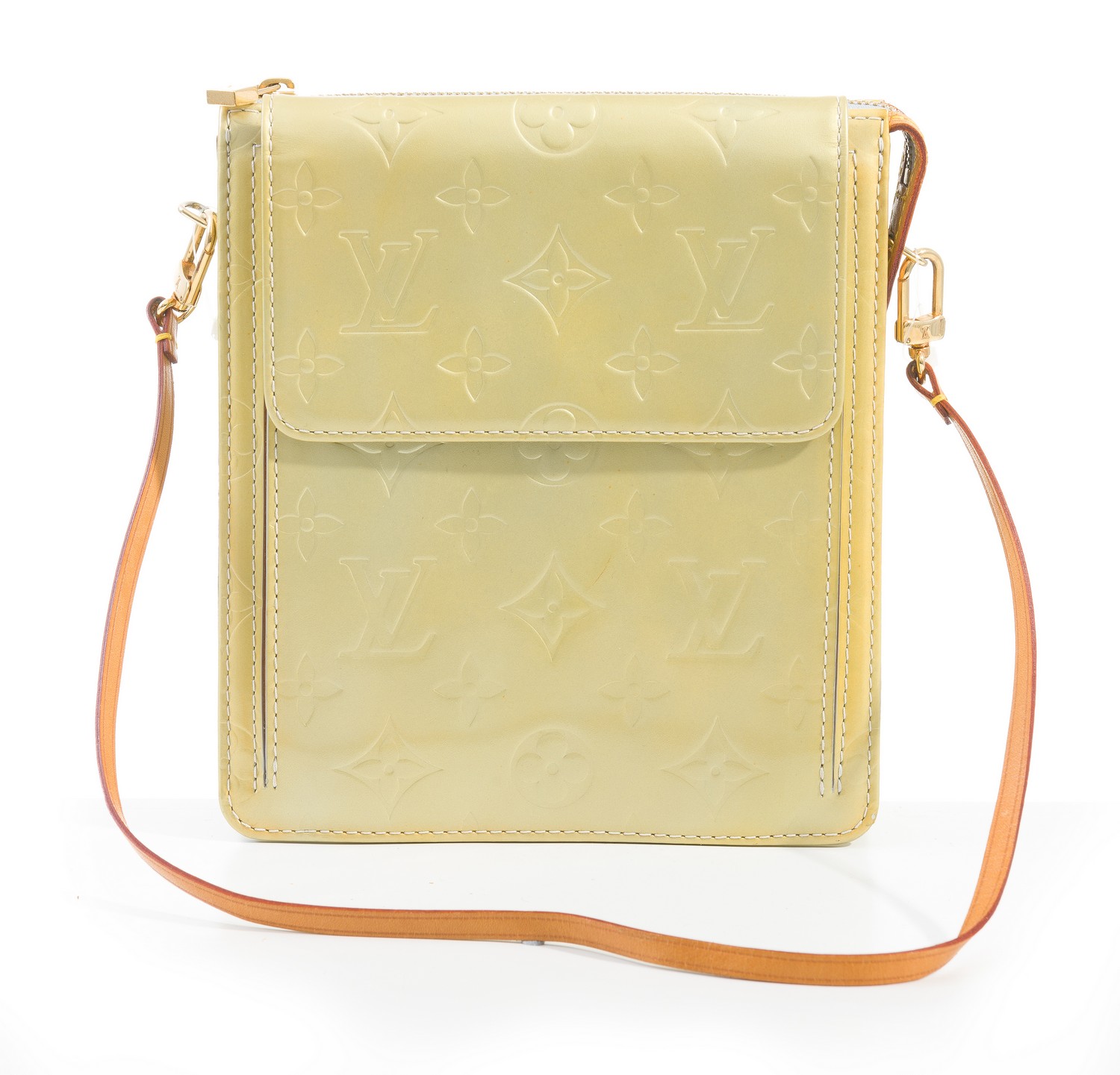 Styled in beige monogram Vernis leather with tan leather trim and gold metal hardware, 16.5 x 18cm