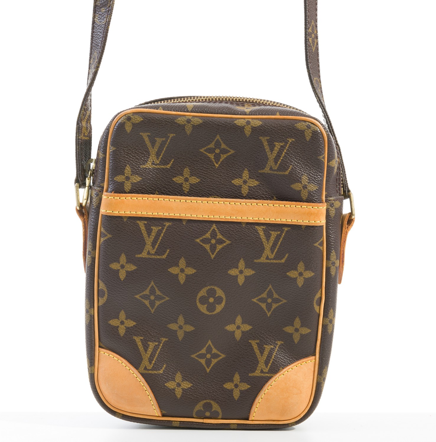 Styled in monogram canvas with tan leather trim and gold metal hardware, 21 x 15 x 5cm.